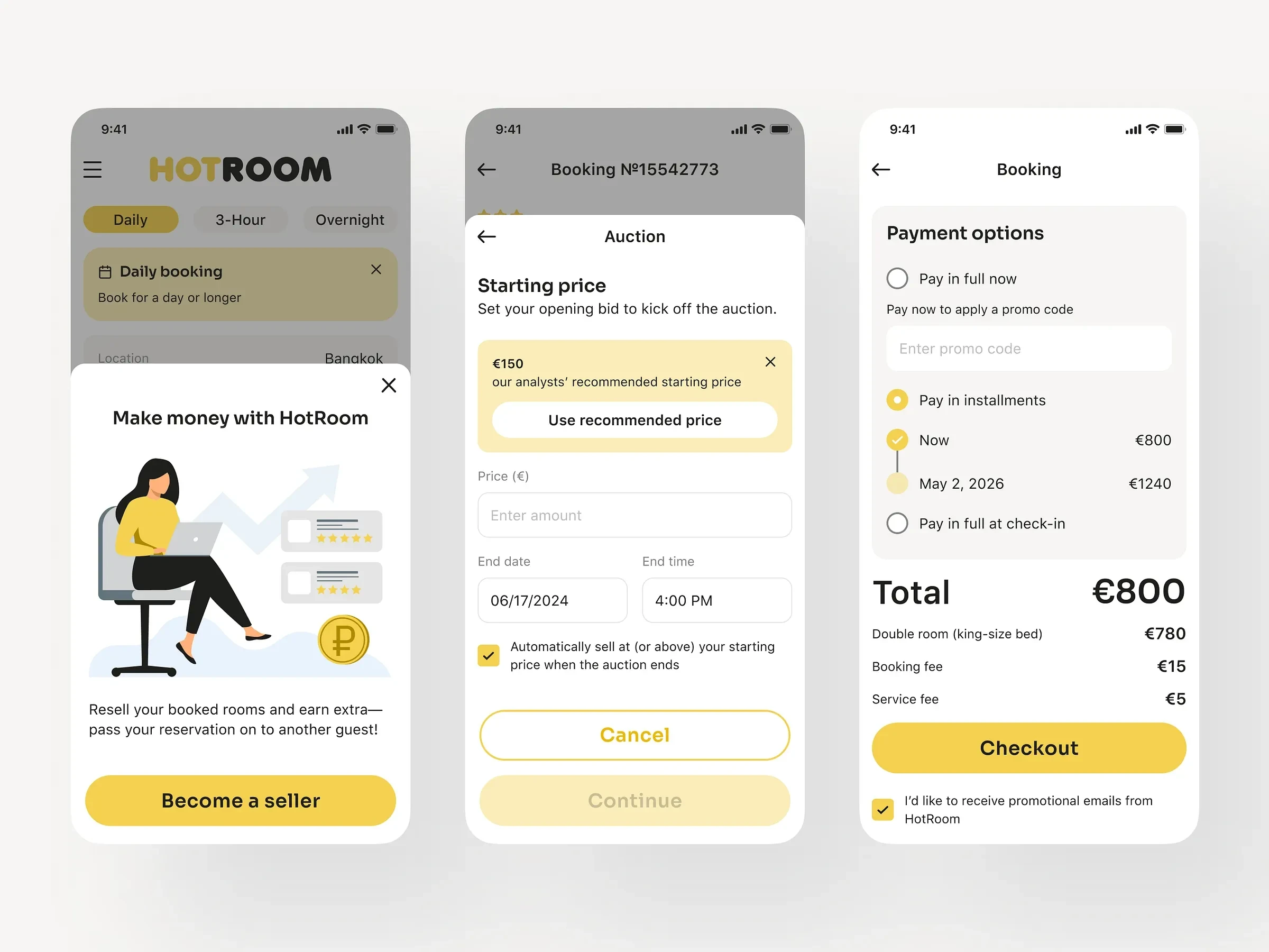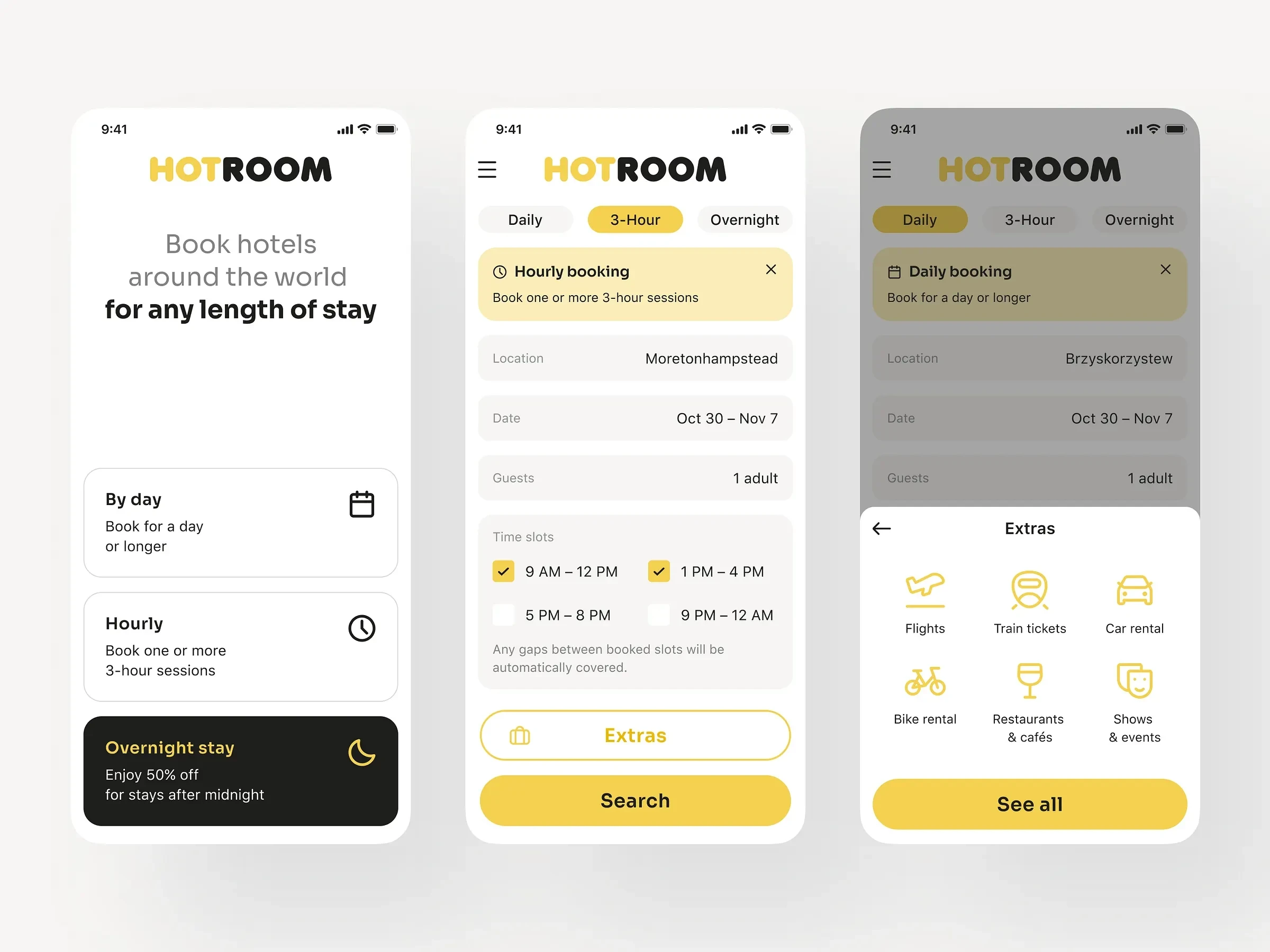 Design a flexible hotel booking mobile application that enables users to book stays by the day, in 3‑hour blocks, or overnight, and offers optional extras like transport and activities—all in a single intuitive interface.