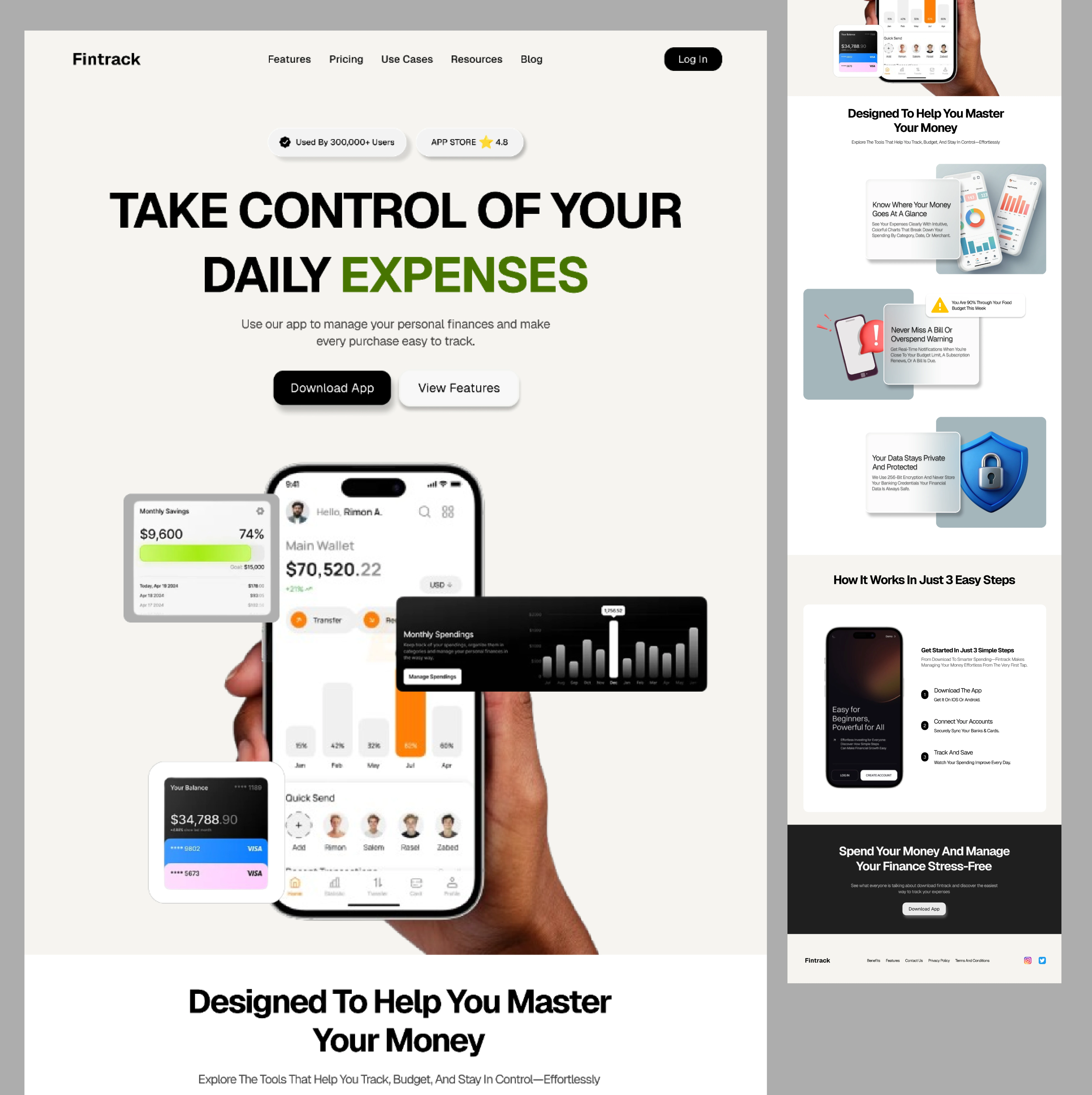 Designed a high-conversion landing page for Fintrack, a personal finance app. The goal was to create a user-friendly interface that builds trust, highlights key app features, and encourages app downloads. I used bold typography, device mockups, and data visualization to communicate value instantly.