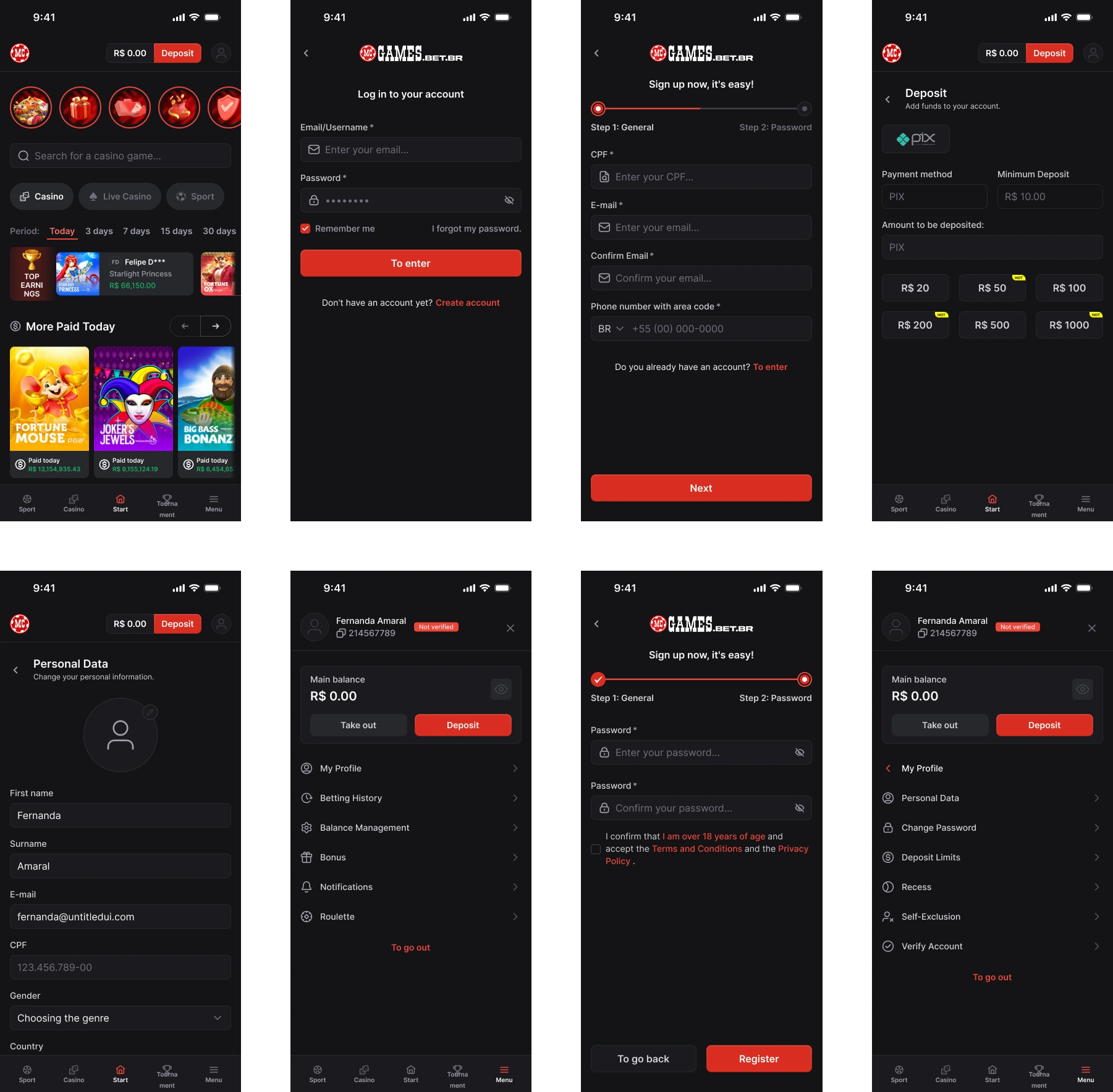 Mobile-first UI design for an online casino and betting platform. The interface features a sleek dark mode with bold red accents to create a high-energy atmosphere while maintaining readability. The layout prioritizes quick access to "Top Earnings" games and utilizes a intuitive bottom navigation bar for seamless switching between Sports, Casino, and Tournaments.