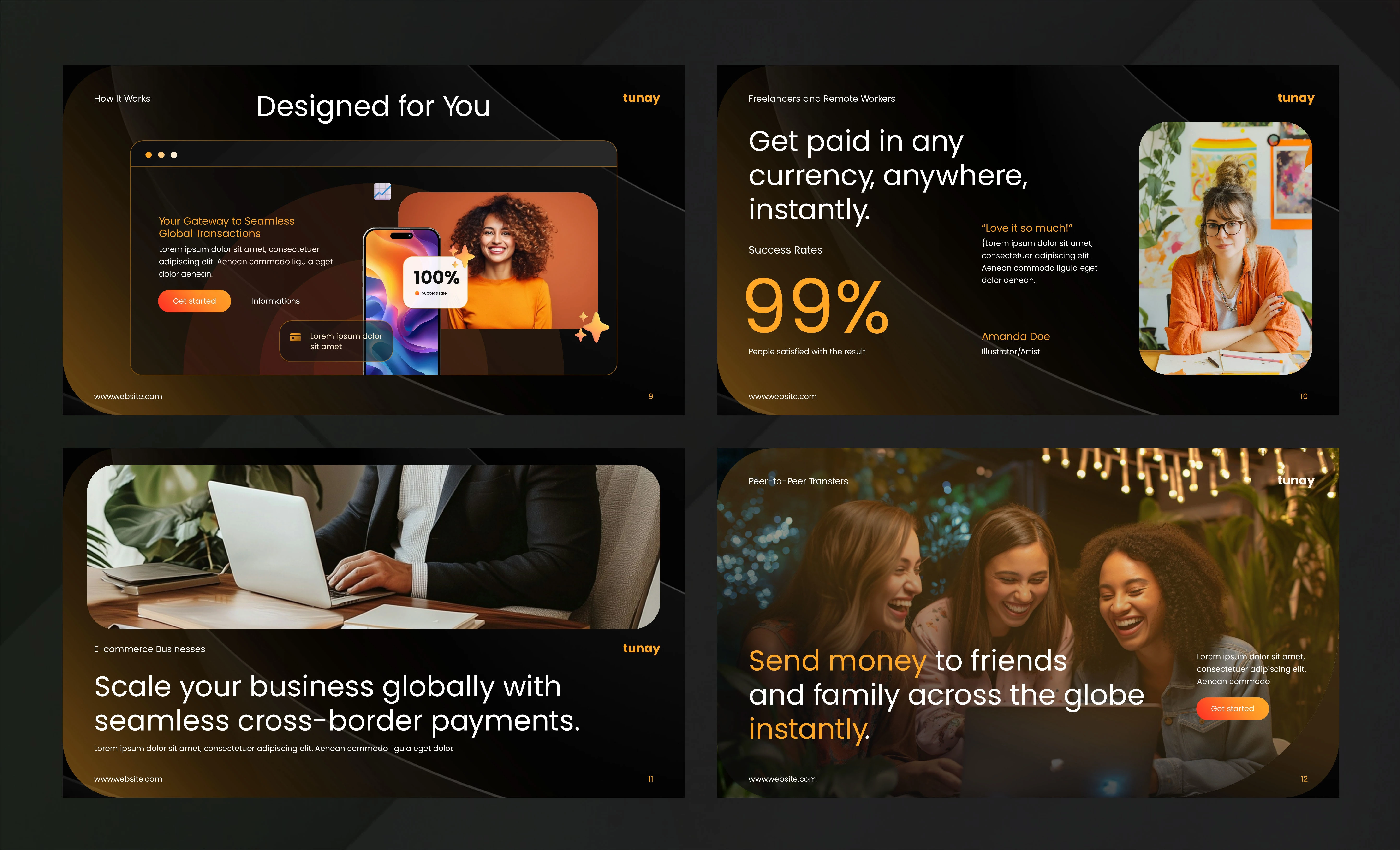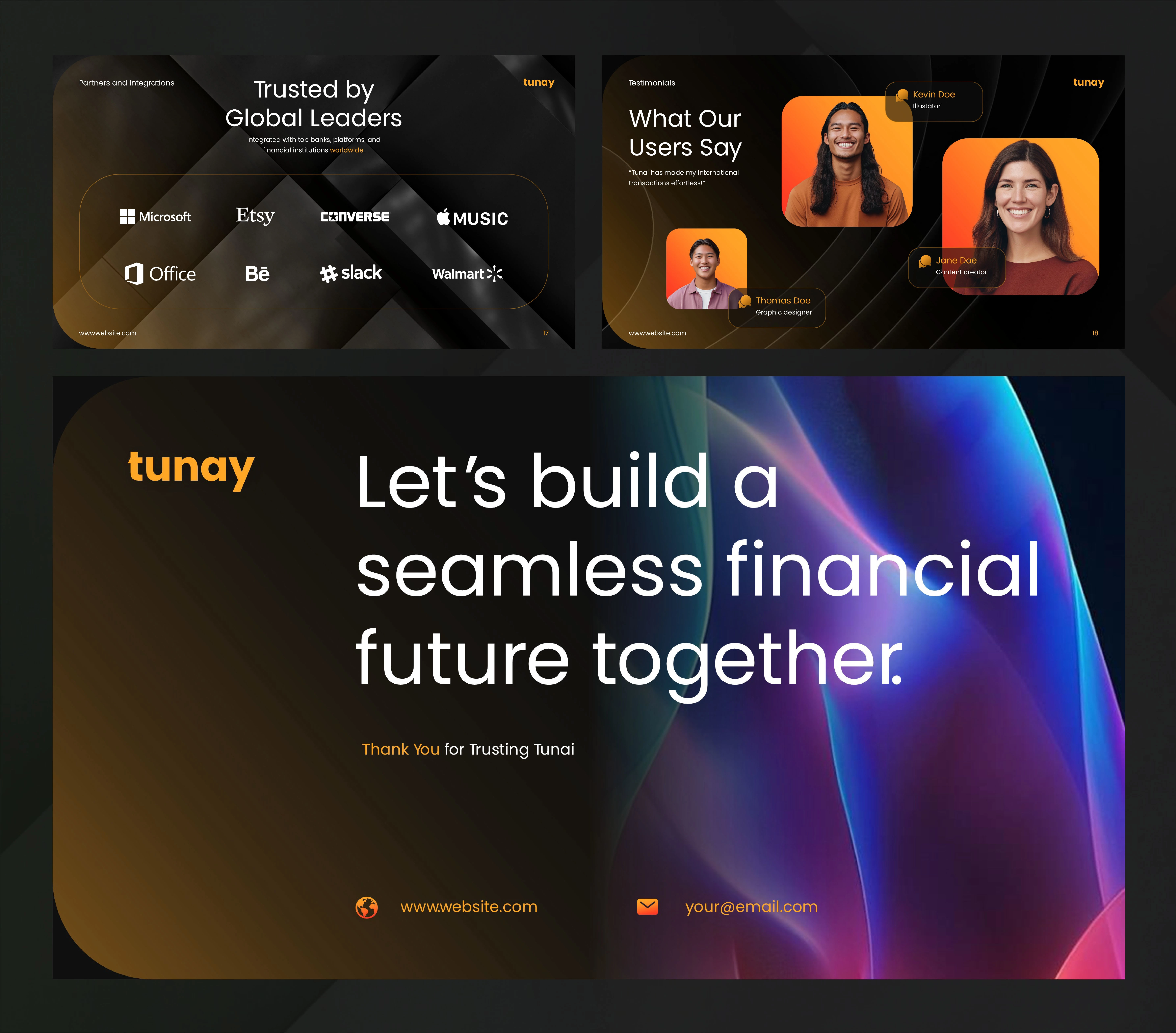 Tunay is a conceptual design exploration for a modern global payment and money transfer platform. Inspired by the seamless experience of PayPal and Payoneer, this project aims to reimagine the digital financial landscape with a cleaner, smarter, and more user-centric approach. The goal is to explore how intuitive design, clear information architecture, and strong visual identity can enhance user trust and simplify global transactions in a digital era.