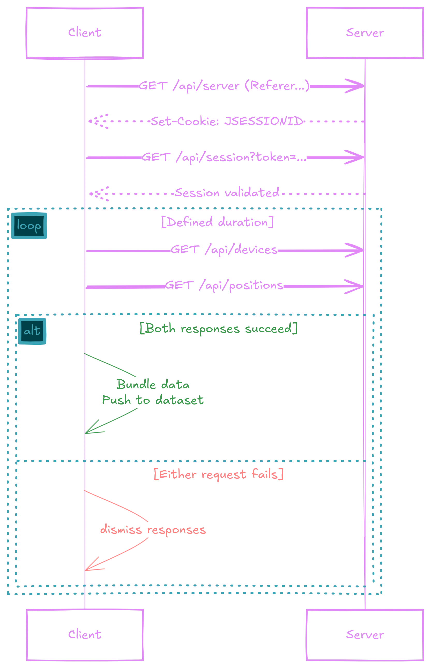/api/devices and /api/positions. When queried with the right credentials, these endpoints provide real-time bus positions that are then displayed by the site. Access required a valid JSESSIONID cookie, which was set by a /api/server request that needed a Referer header that included a specific token from the client. A subsequent request to /api/session?token=... validates the session.