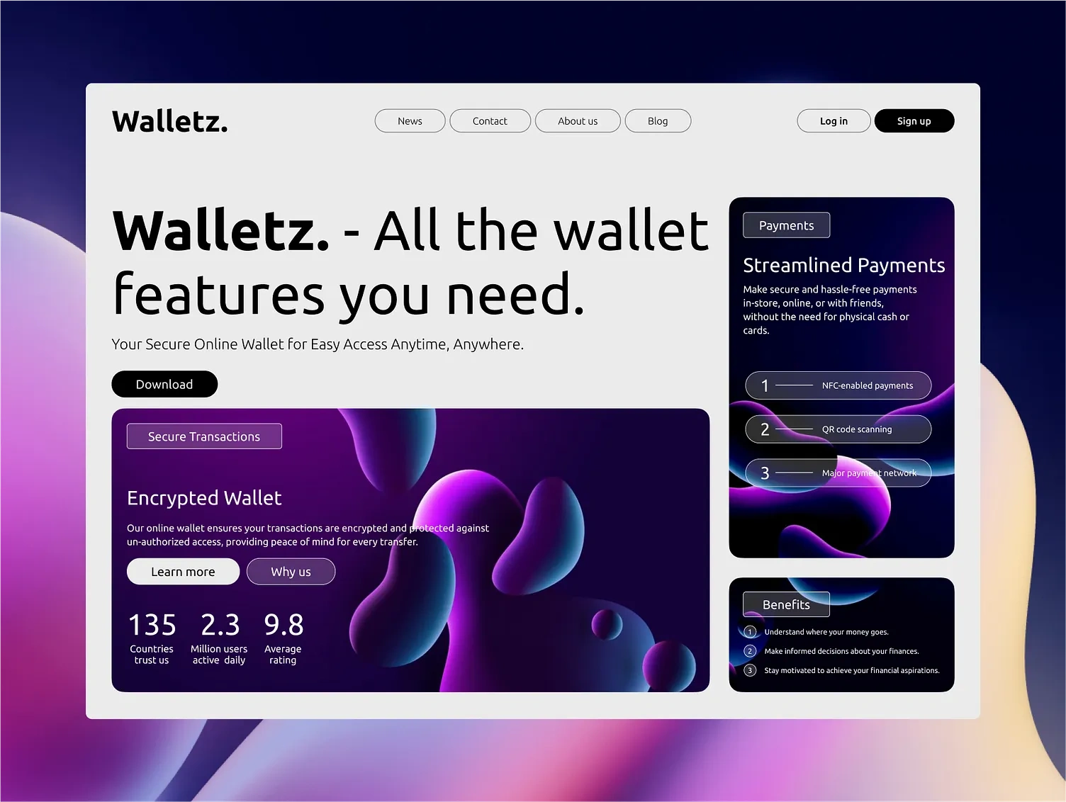 This project is a modern and visually striking landing page design for Walletz, a secure digital wallet platform. The design emphasizes clarity, trust, and cutting-edge technology through a clean layout, bold typography, and vibrant gradient visuals.