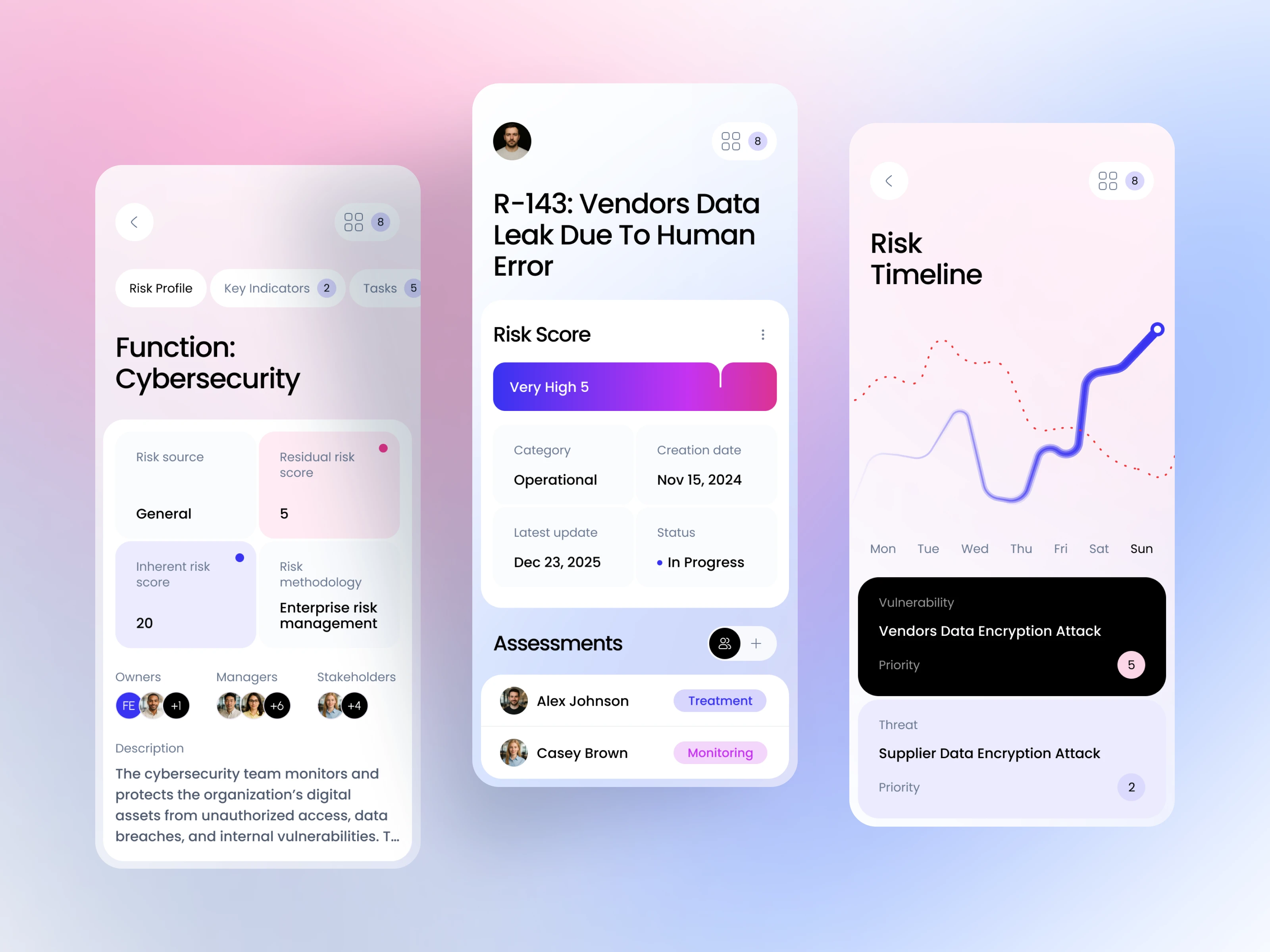 Modern mobile app UI for enterprise risk management and cybersecurity. It helps track incidents, assess risk scores, and monitor vulnerabilities in real time.