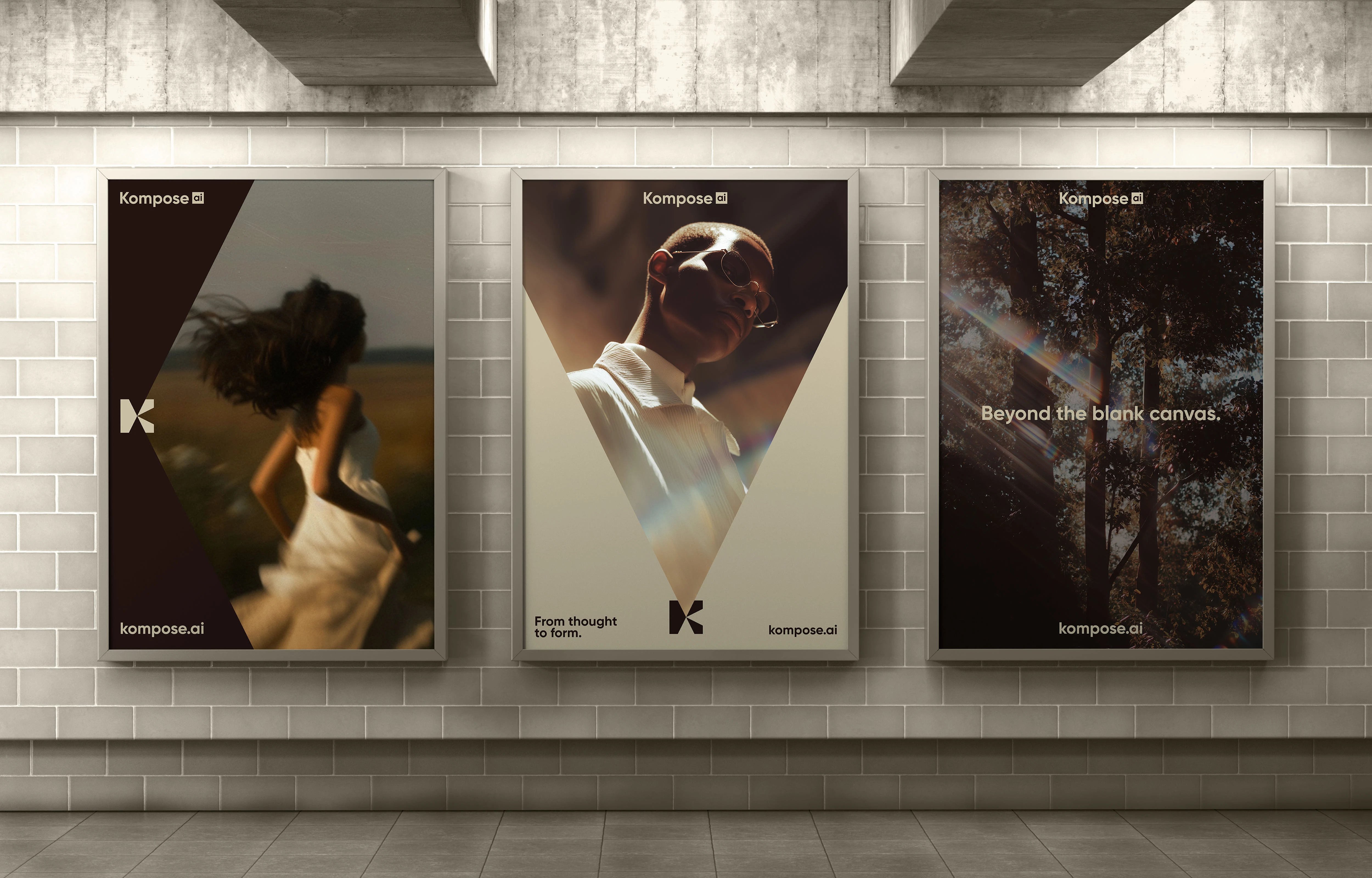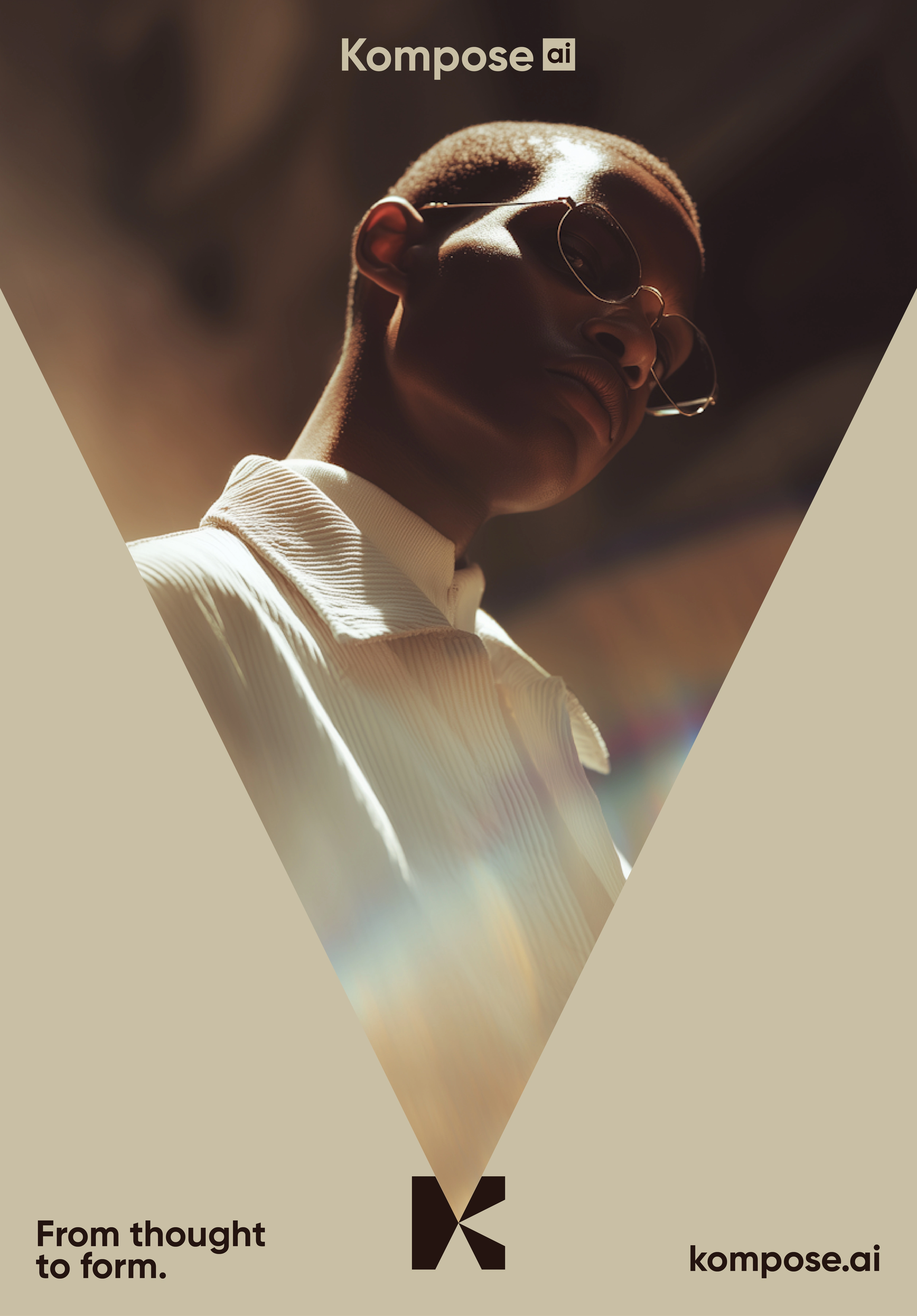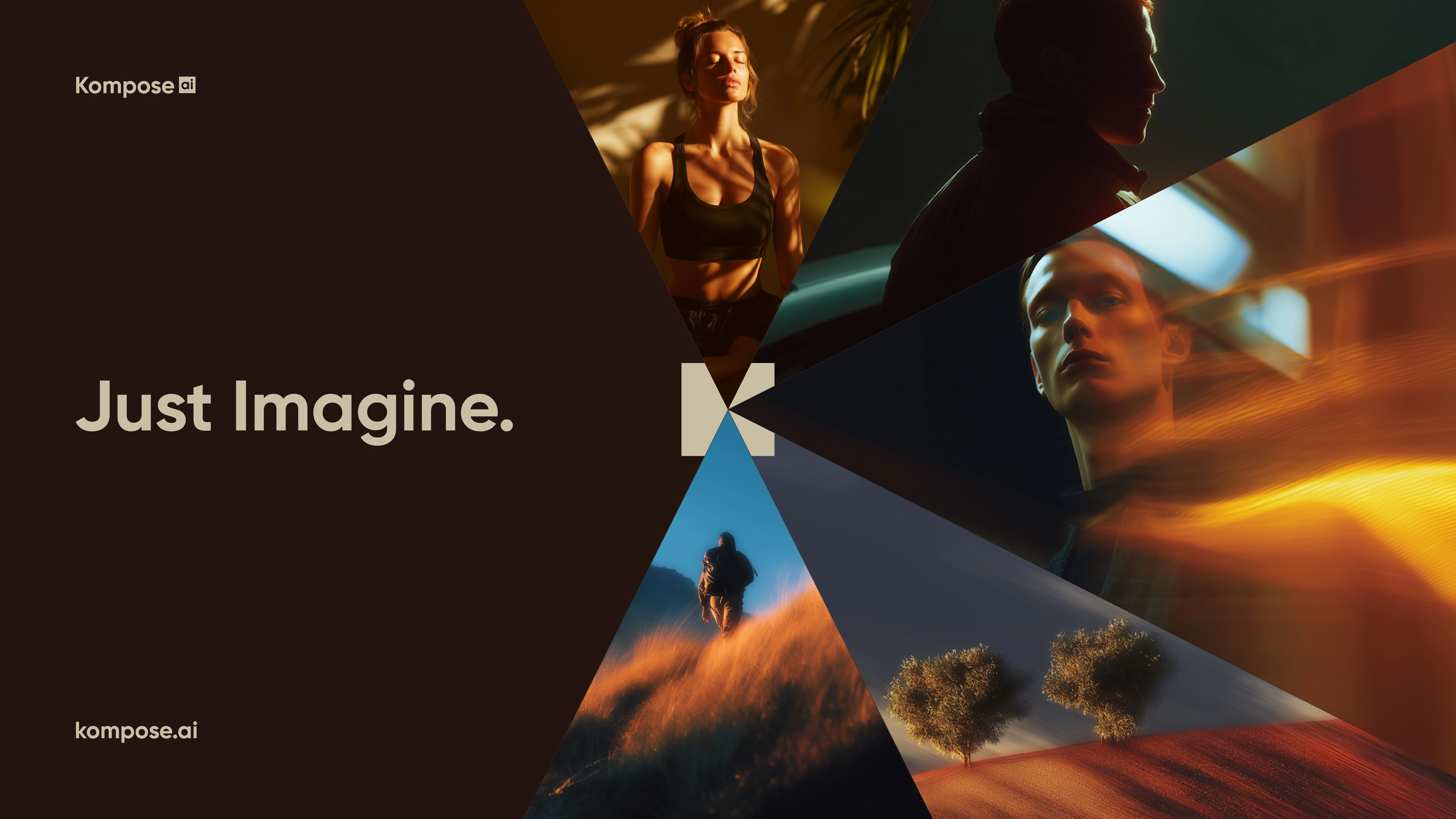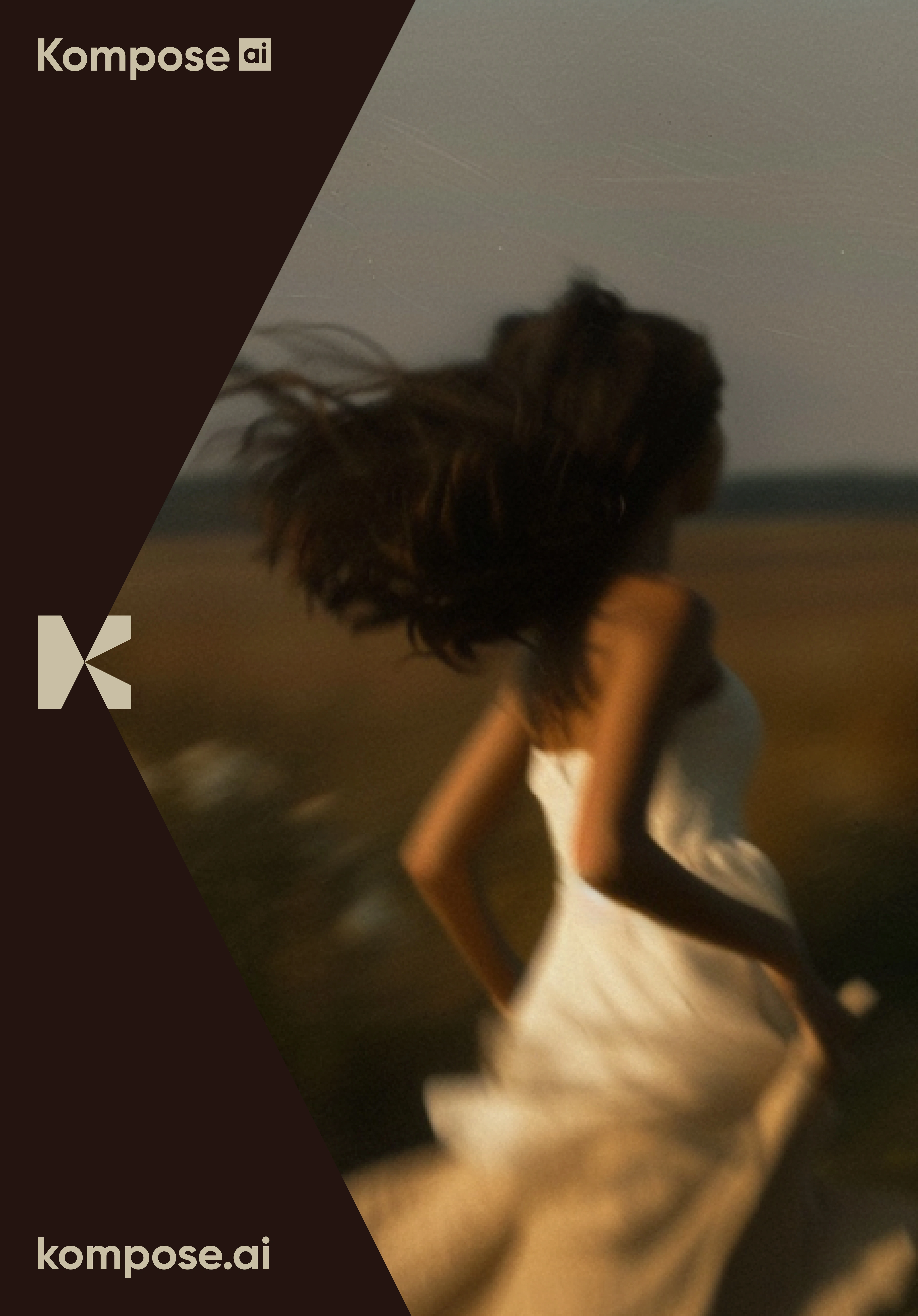 A restrained, almost editorial palette. Deep espresso brown as the base, warm bone as the counterweight. No neon, no gradients, no AI-cliché iridescence. The system is built to feel closer to a fashion publication than a tech product. The K-mark frames every image, turning each render into something seen through a lens, not generated in a tab. Type is a clean geometric sans, set tight and confident. Imagery does the emotional work. Cinematic light, real grain, soft motion, faces in shadow. The product is AI. The feeling is film.