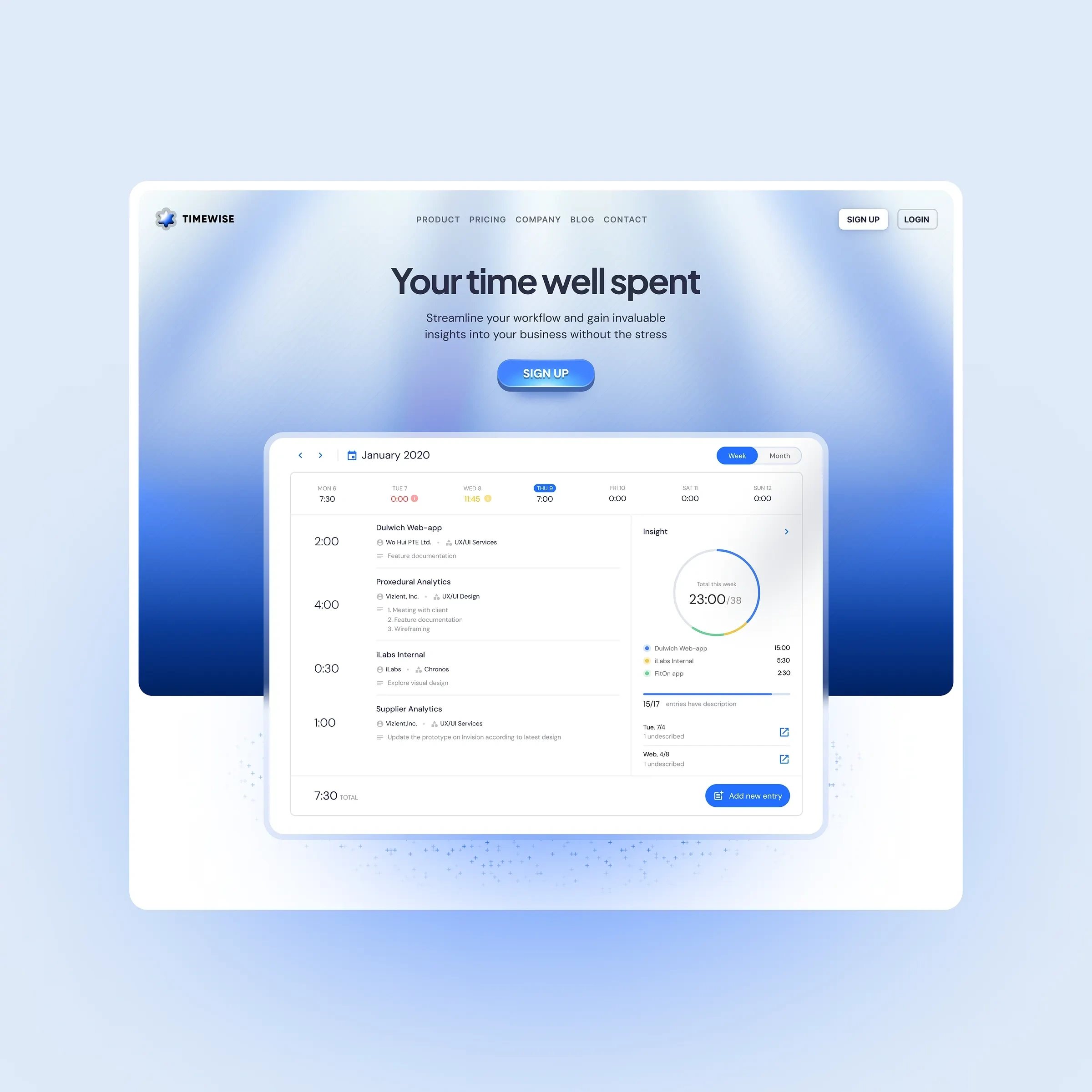 I led the full product and web design for Timewise, focusing on a clean, calm UI for time tracking, tasks, and client workflows.