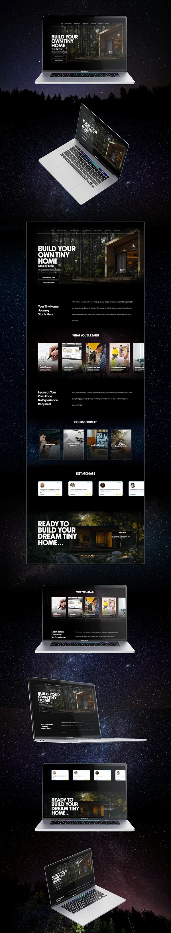 The Build Your Own Tiny Home landing page was designed to promote an online course available on platforms such as LinkedIn Learning, Udemy, Skillshare, and other North American online education sites. The goal was to create a visually engaging, easy-to-navigate landing page that clearly communicates the value of the course and encourages sign-ups.