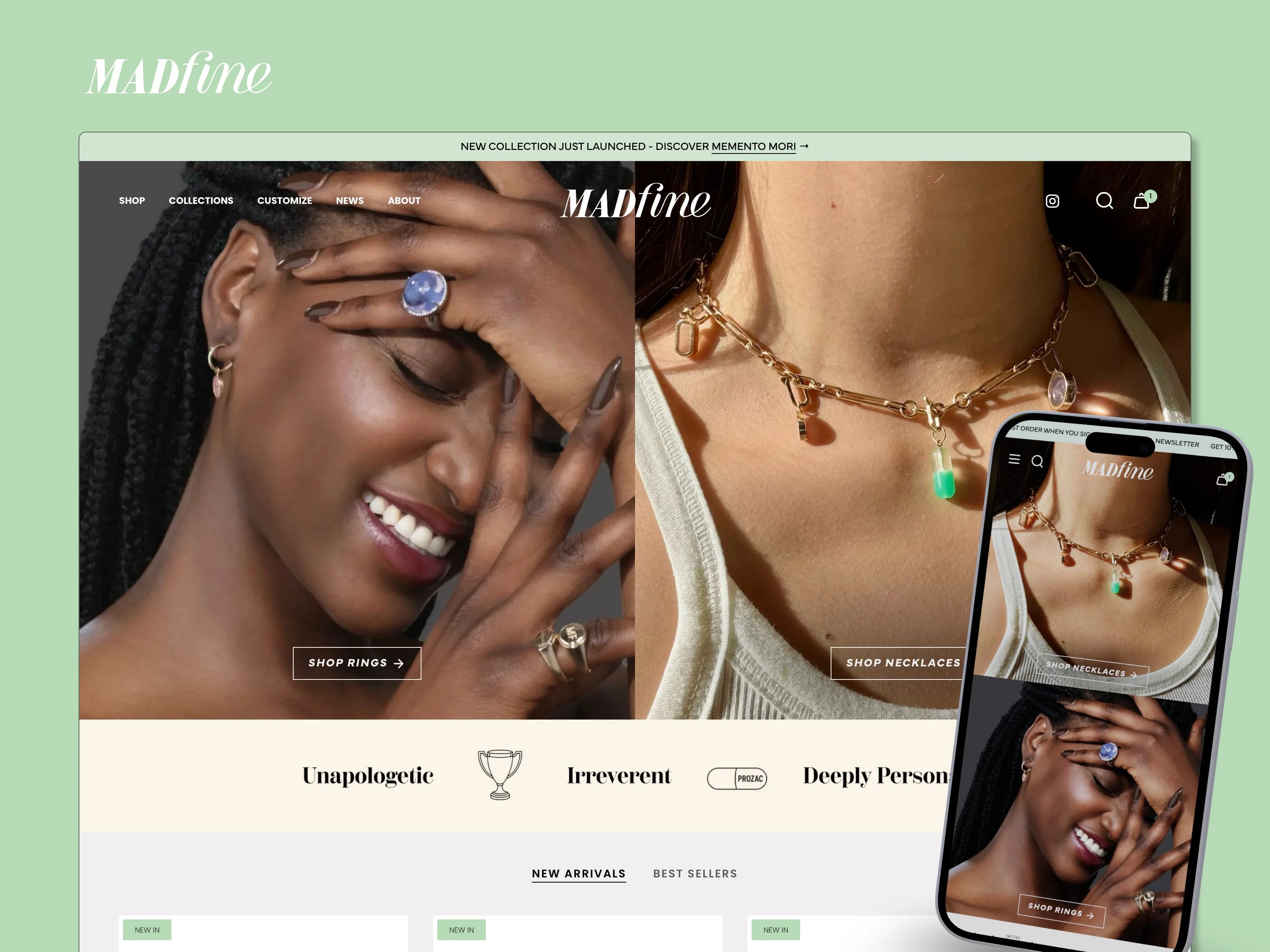 Starting with a UX audit and visual direction workshop, I mapped customer journeys for two distinct browsing types — those shopping for jewelry, and those browsing by cause. Prototyping in Figma allowed us to test different layouts and color treatments before developing the final site in Shopify 2.0, with flexible sections and custom blocks that the team could manage internally.