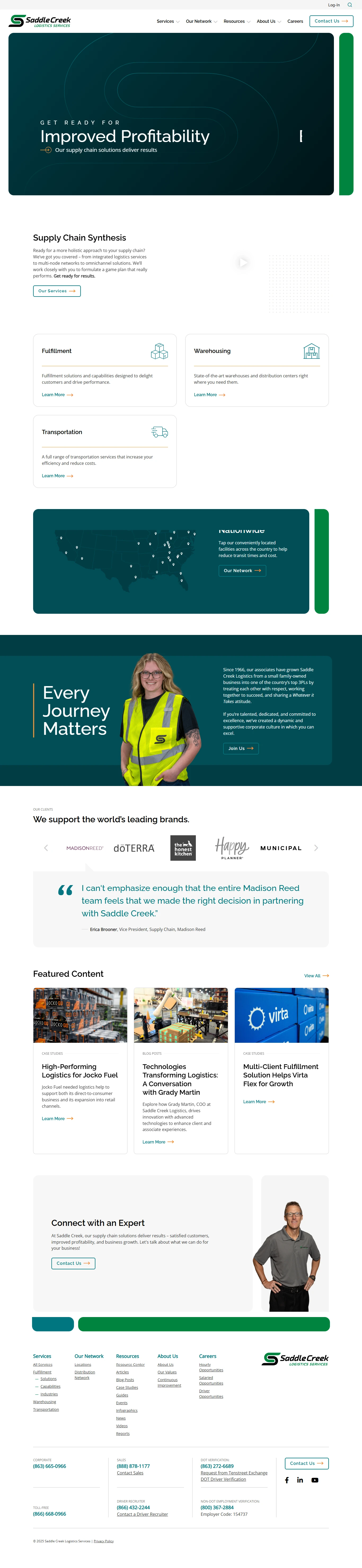 Saddle Creek Logistics Services is an industry-leading third-party logistics (3PL) provider. In business since 1966, they’ve evolved from a family-owned operation into a major player in the supply chain industry, known for their omnichannel solutions. Their core services, fulfillment, warehousing, and transportation, are designed to help businesses manage complex logistics, improve profitability, and scale for growth.