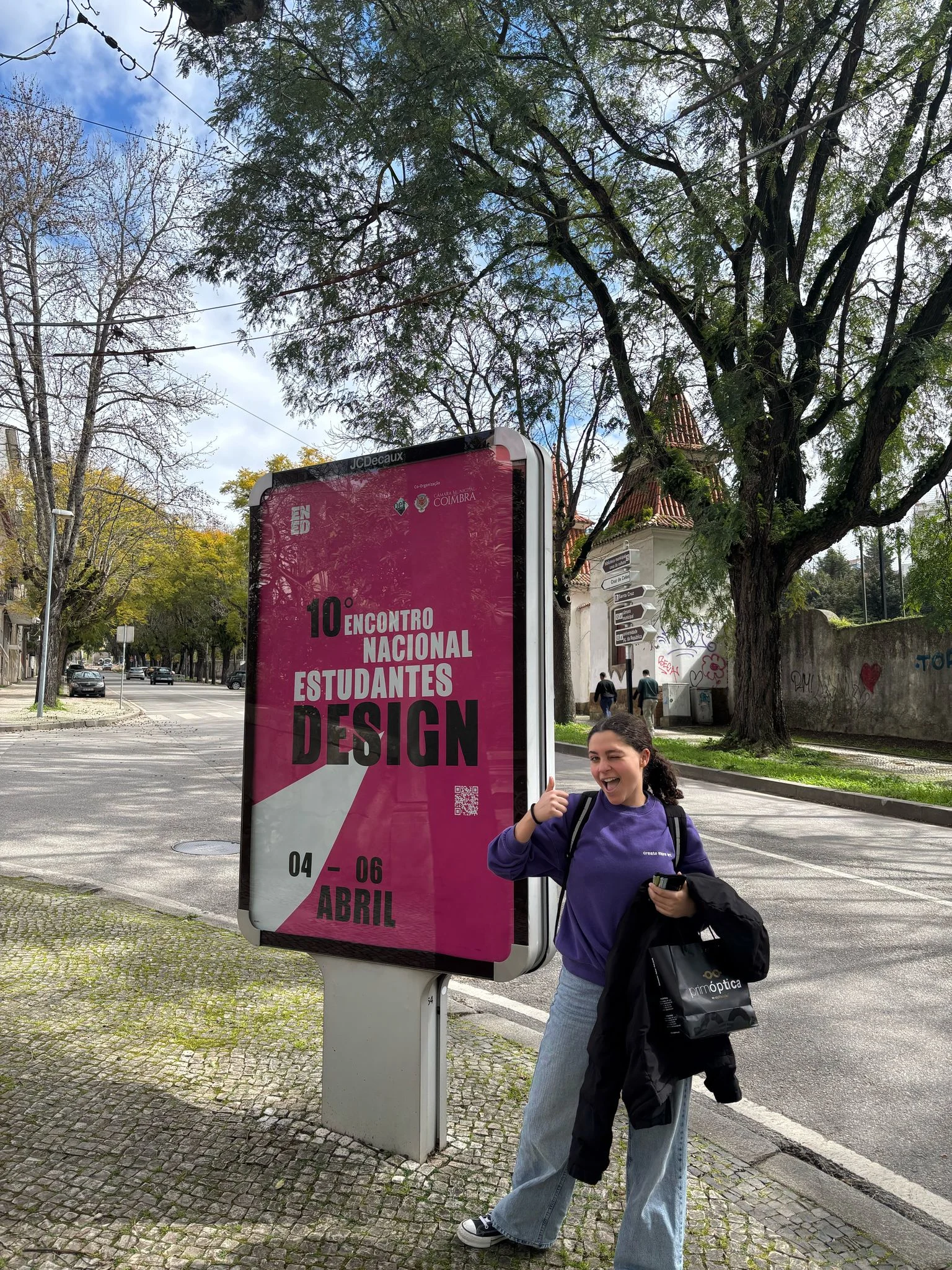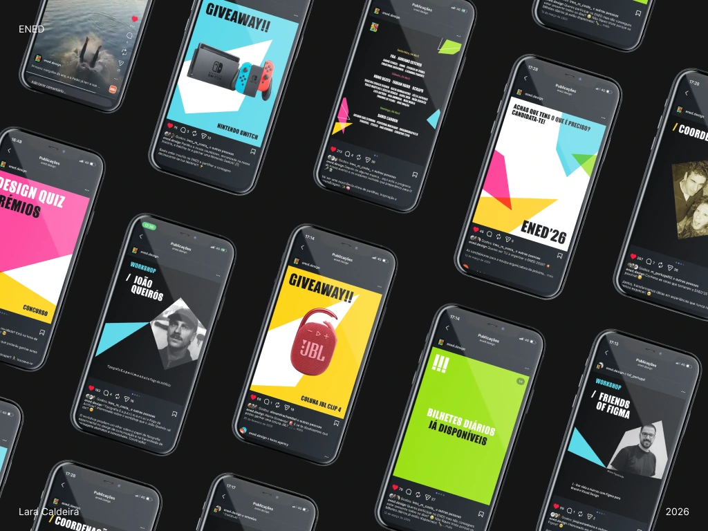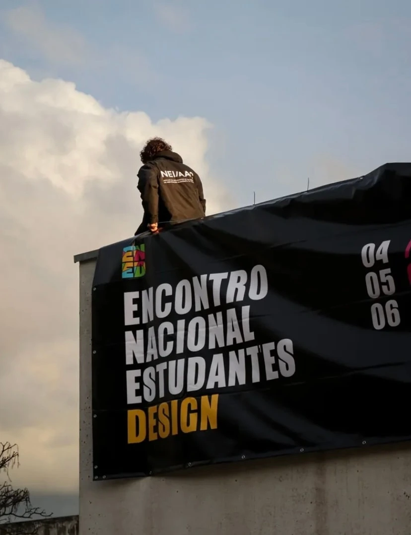 The National Design Students Meeting is an annual event that brings together students from all over Portugal. In its 10th edition, held in Coimbra, I took on the coordination of the Image department and, me and my teaam, were responsible for the entire identity and communication of the event. The starting point was to create something that represented the city without resorting to the obvious image of the university tower, avoiding what is common and traditional. The inspiration was the Pedro and Inês bridge, which resulted in a set of colorful and strong shapes that blend together through color overlays. This dynamic image was applied in the development of merchandising, website, social media, video, and various advertising materials.