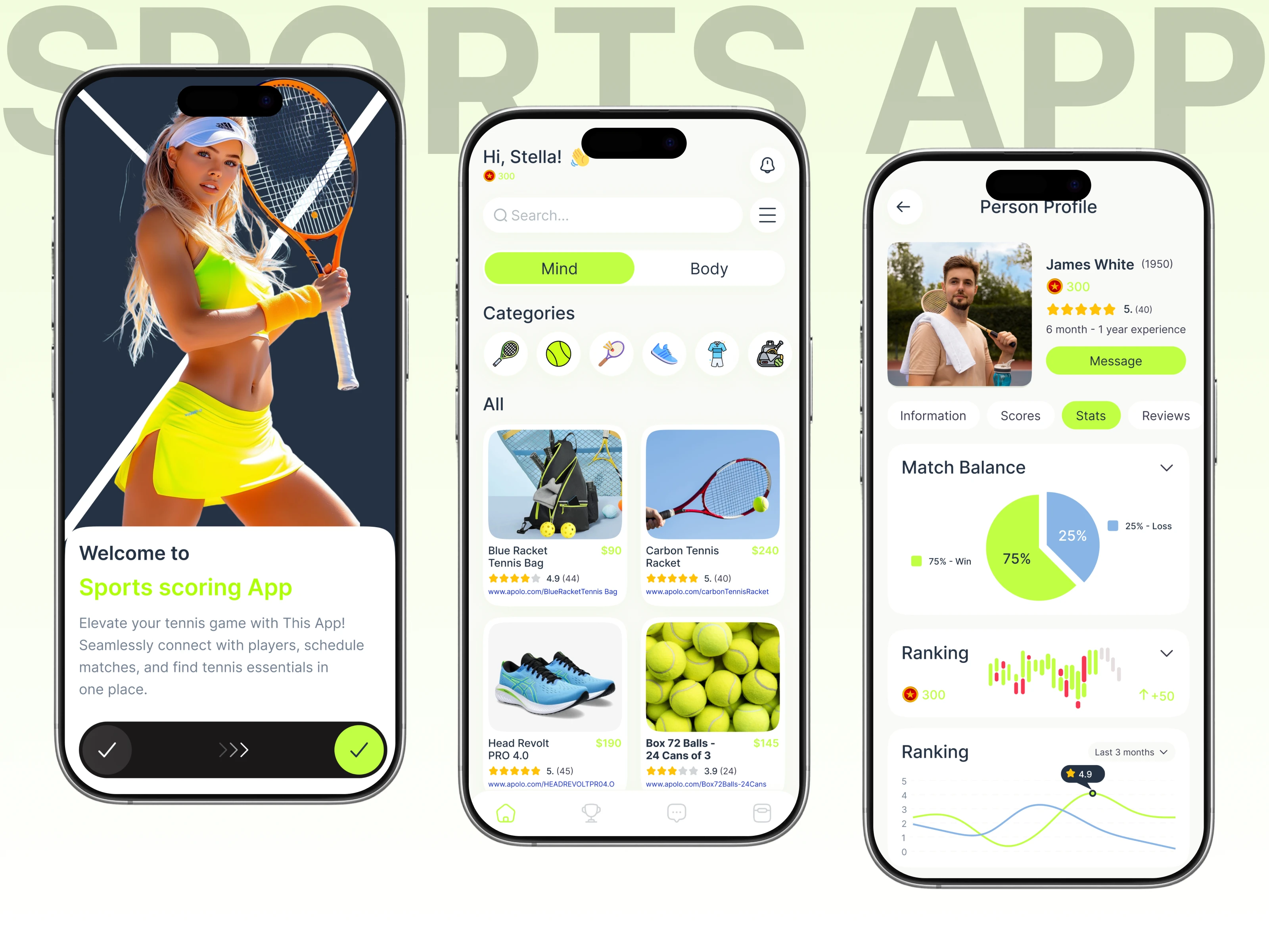 This mobile experience helps athletes and fans easily track scores, rankings and match statistics in real-time. Users can browse categories, shop for gear, follow their favourite players, and view their personal match history and ranking charts — all in one clean and energetic interface.