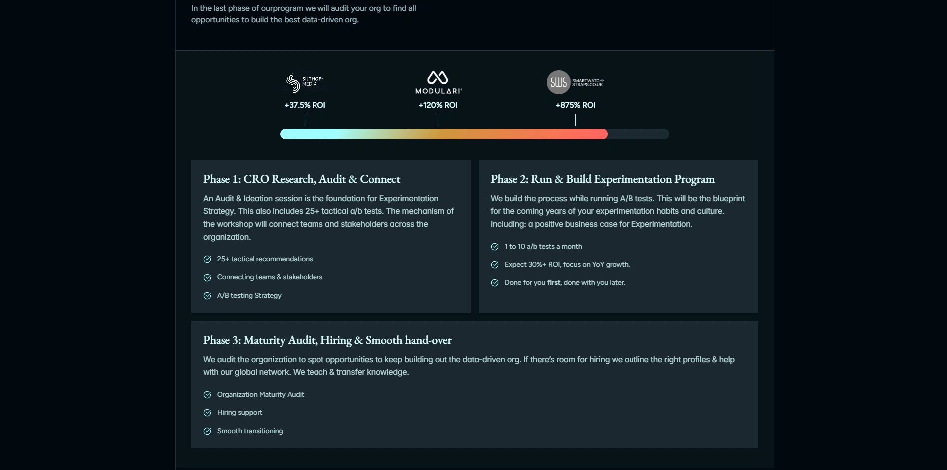 Beyond results, we establish repeatable experimentation processes and craft a compelling business case for your leadership team — securing the buy-in and resources needed to build an in-house experimentation function that lasts.