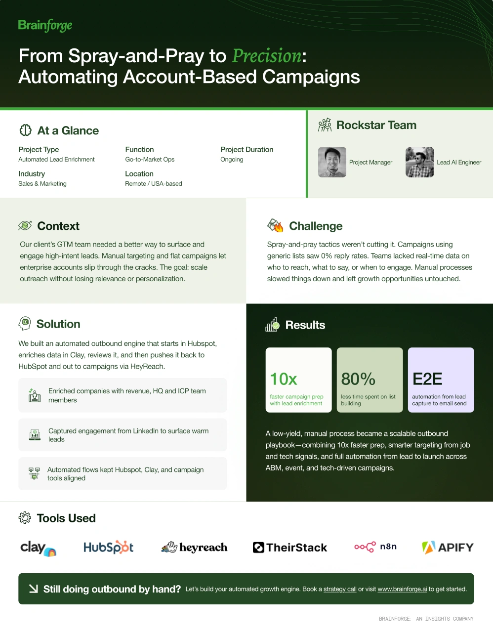 We built an automated outbound engine that starts in Hubspot, enriches data in Clay, and then pushes it back to HubSpot and out to campaigns via HeyReach.