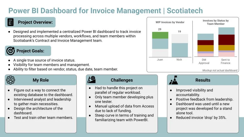 Designed and implemented a centralized Power BI dashboard to track invoice processing across multiple vendors, workflows, and team members within Scotiabank’s Contract and Invoice Management team.