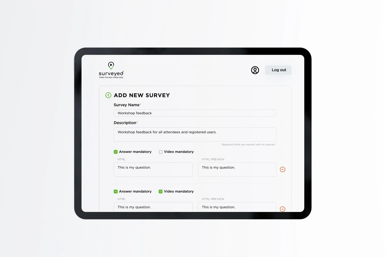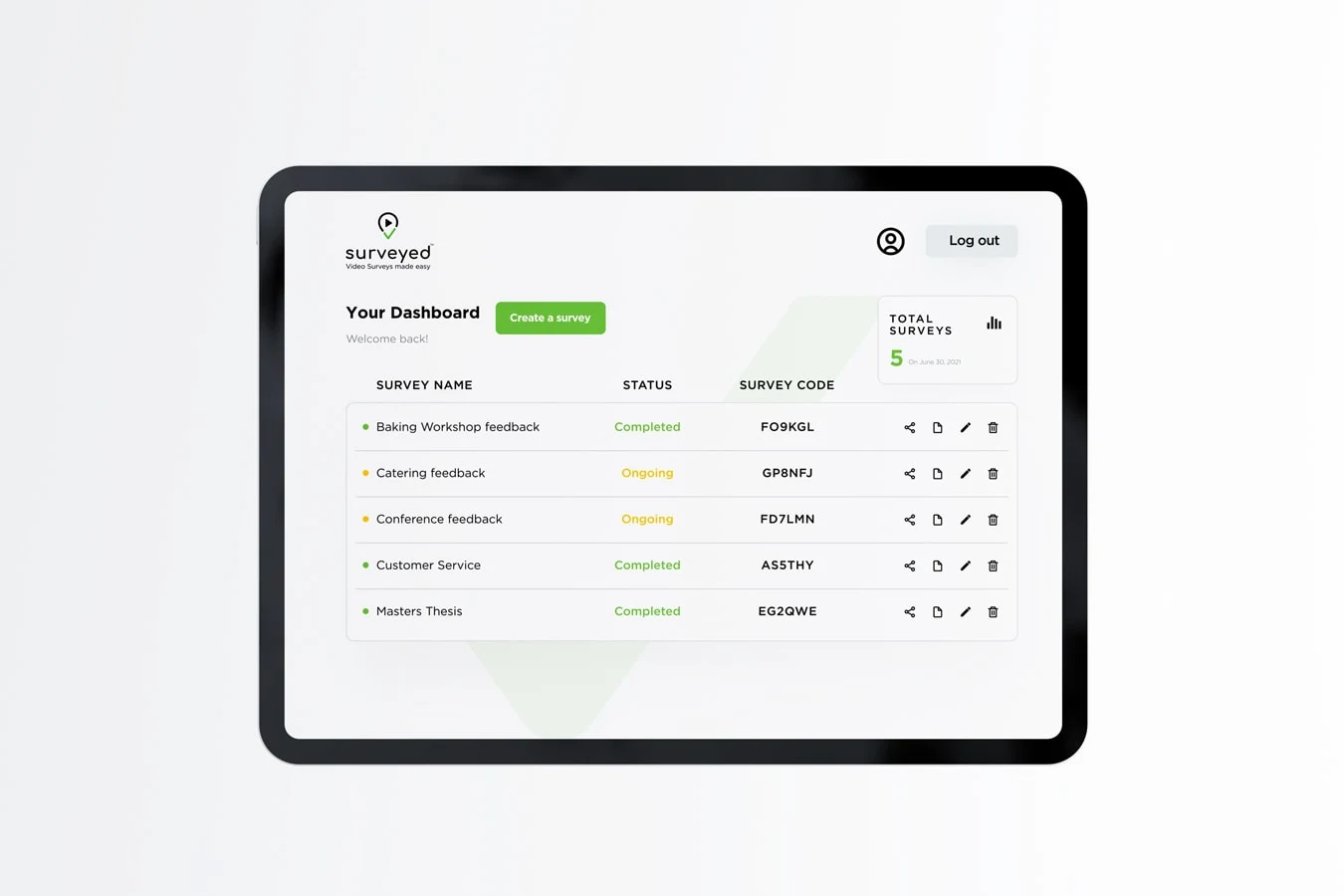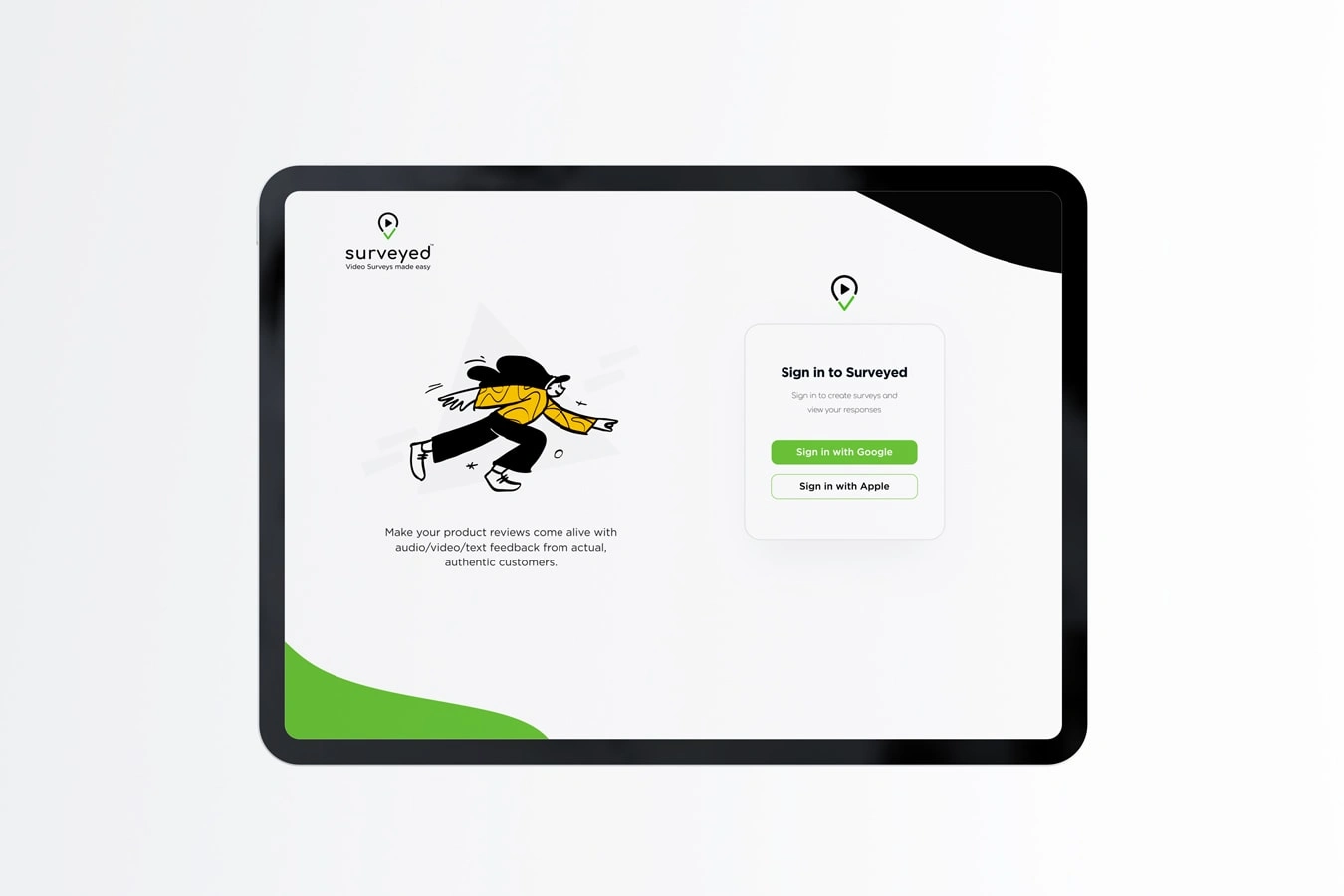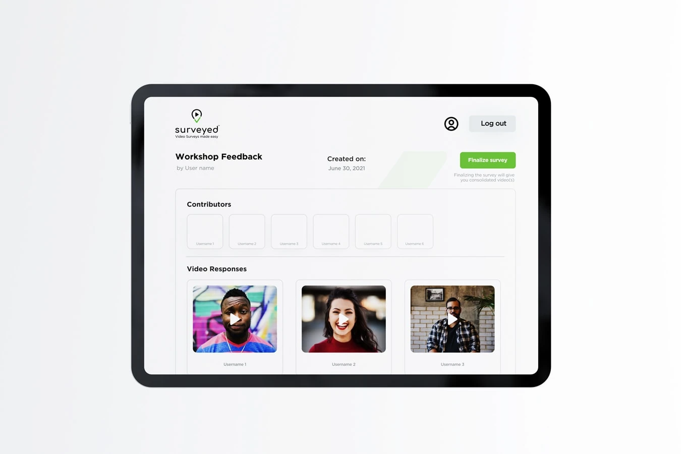 With a video based survey service being the primary focus, the app was designed for both iOS & Android. Alongside the app, the website was also kept in mind to match the interface of the app in terms of visuals and user interface. The website design includes a main landing page as well as an admin page, which gives an overview of the existing surveys.