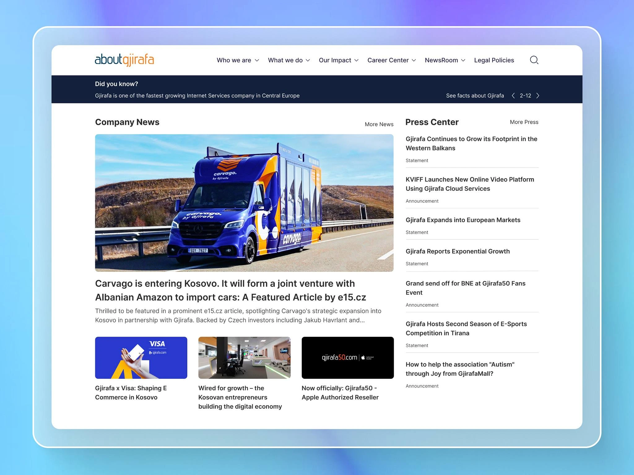 Gjirafa, Inc., is a US corporation, a video content platform and production studio, and a market leading E-commerce company; leads variety of offline to online Internet consumer services in Balkans and Albanian Diaspora. It is the fastest growing Internet Services company in the Balkans and one of the most well-funded VC startups, from globally reputable investors, in Europe. Our vision is to build and facilitate the Internet Economy in the Balkans, by focusing one core Internet services that lack in the region for a market of around 12 million people