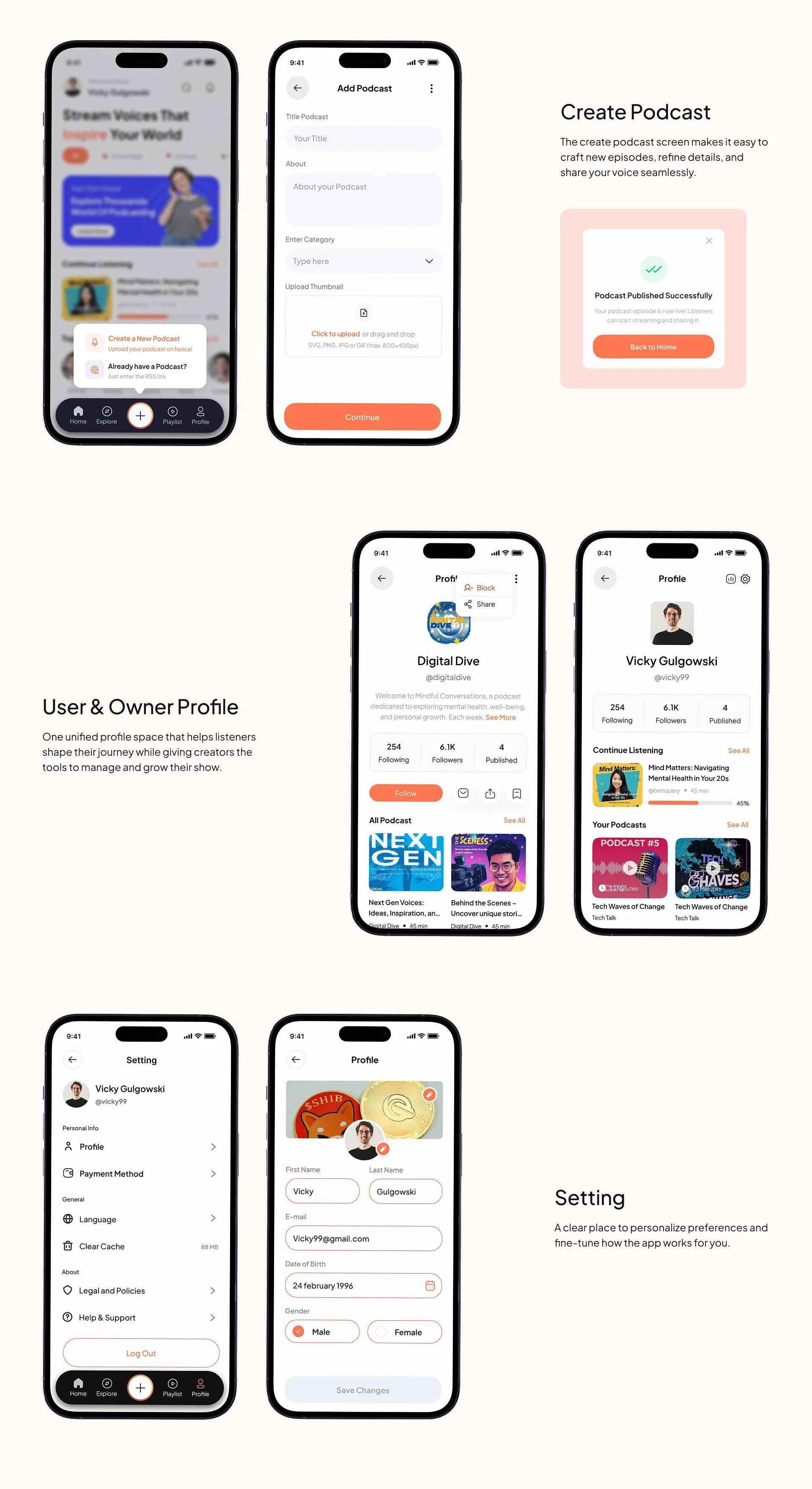 From uploading podcasts to managing profiles and settings, every step is streamlined — reducing confusion and making creation feel premium.