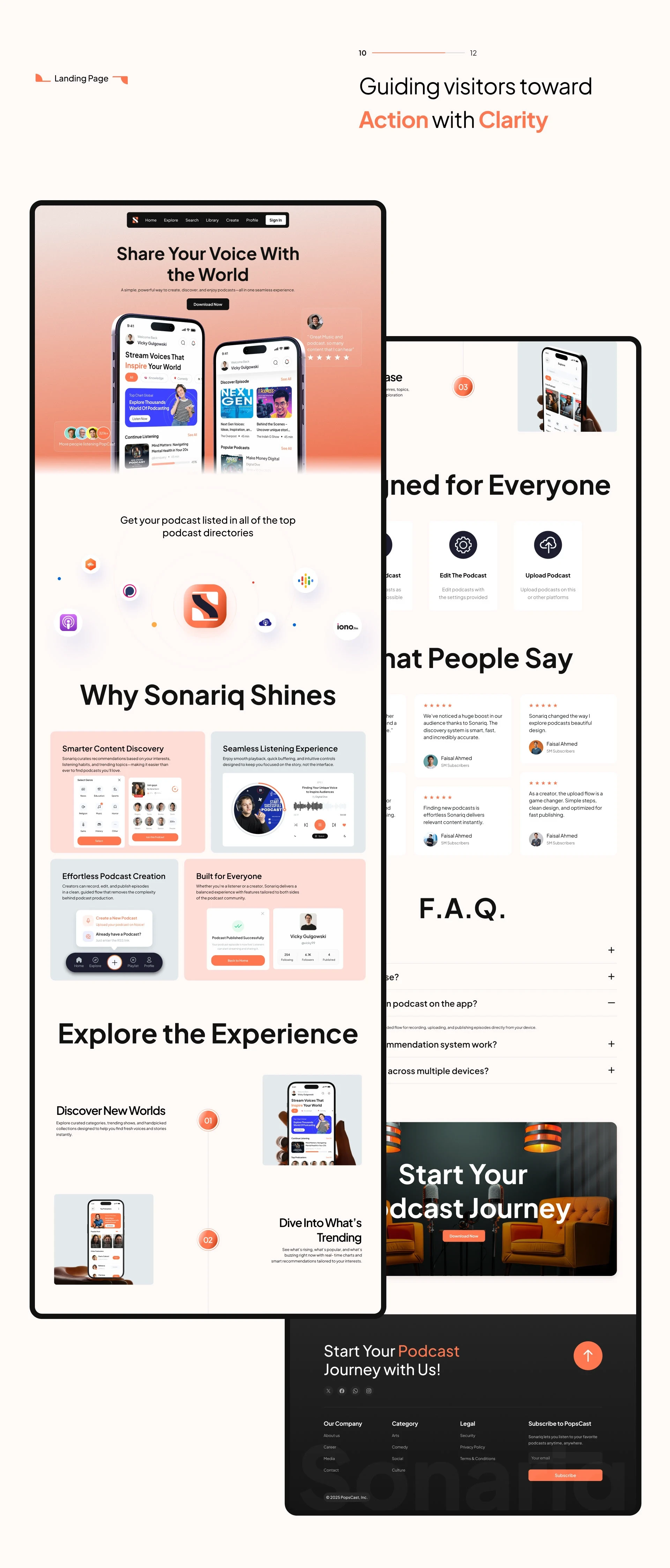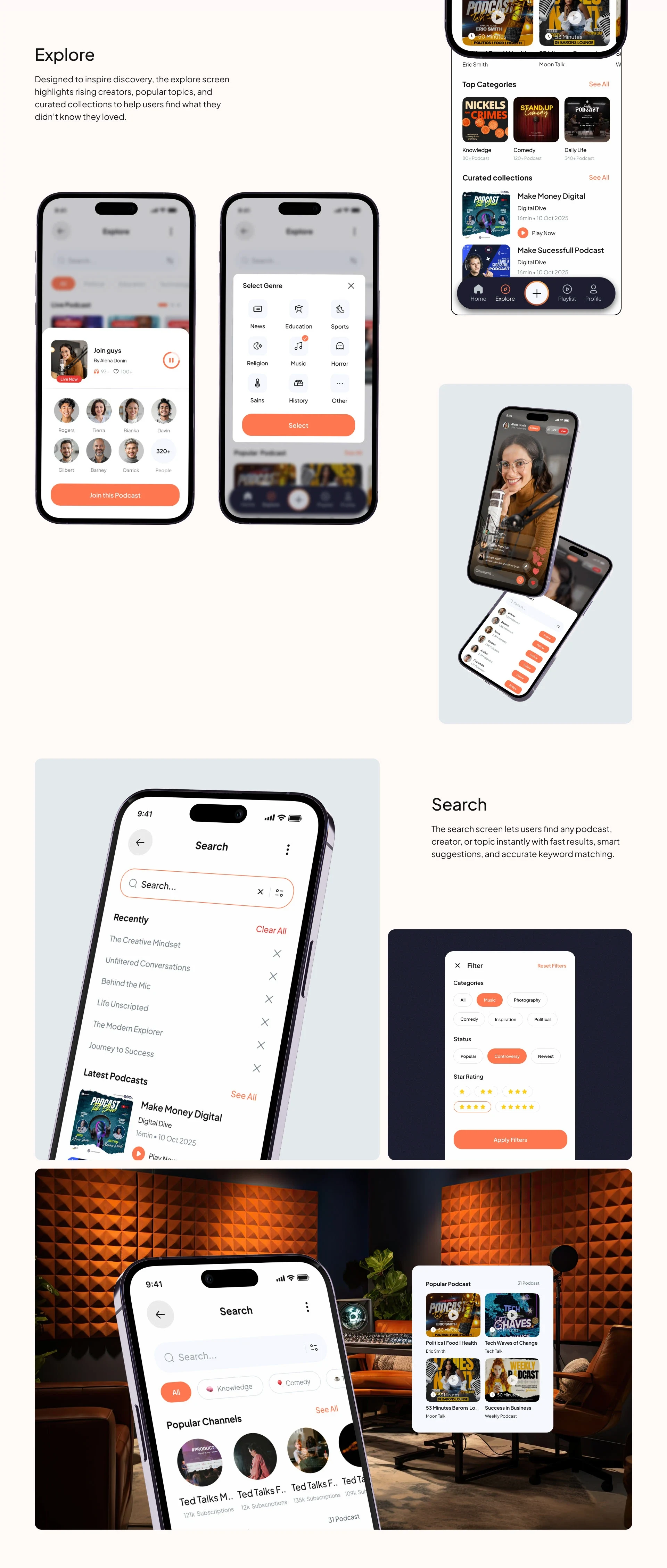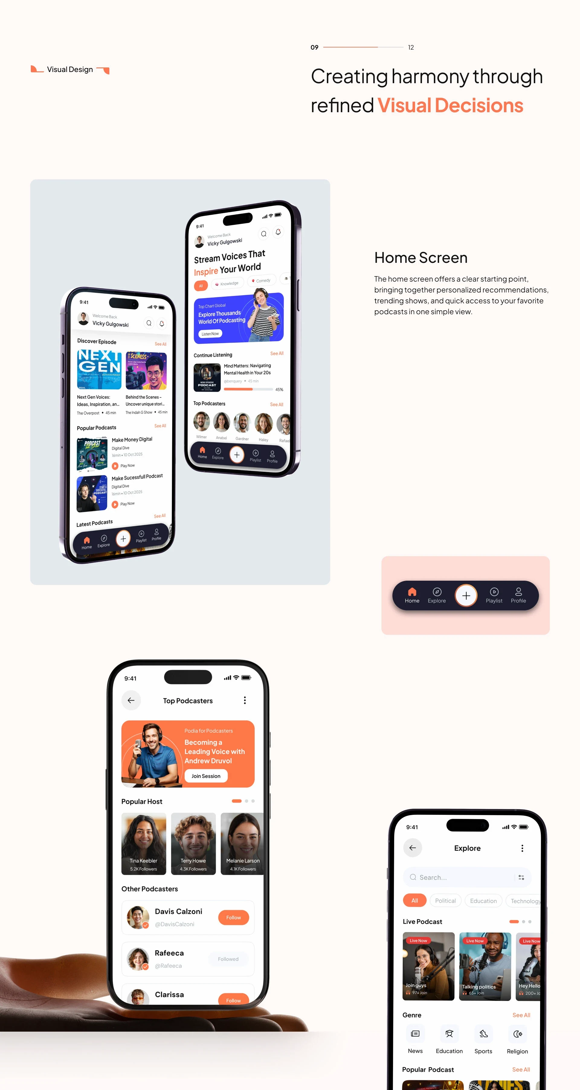 A next-gen podcast app concept designed to simplify creating, sharing, and listening — with a clean UI and strong brand system.