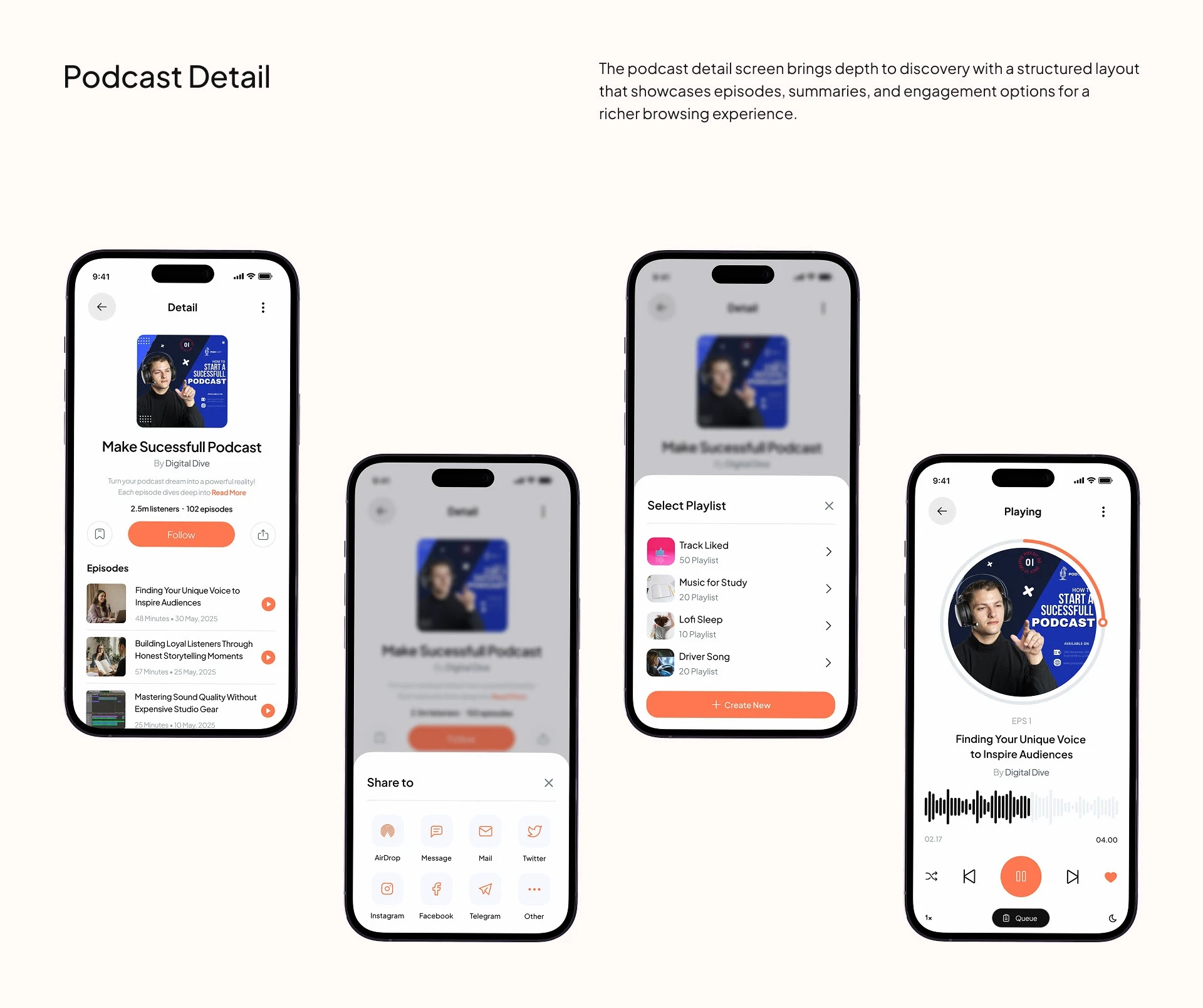 Structured podcast pages and a focused player UI make it easy to follow, save, share, and stay immersed in listening.