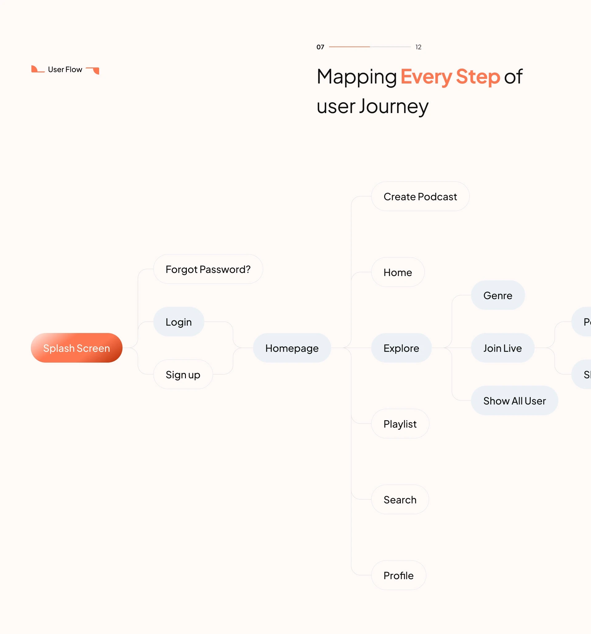 A clear flow that communicates product thinking. It shows structure from splash → auth → homepage → explore → playlist → profile, making the case study feel complete.