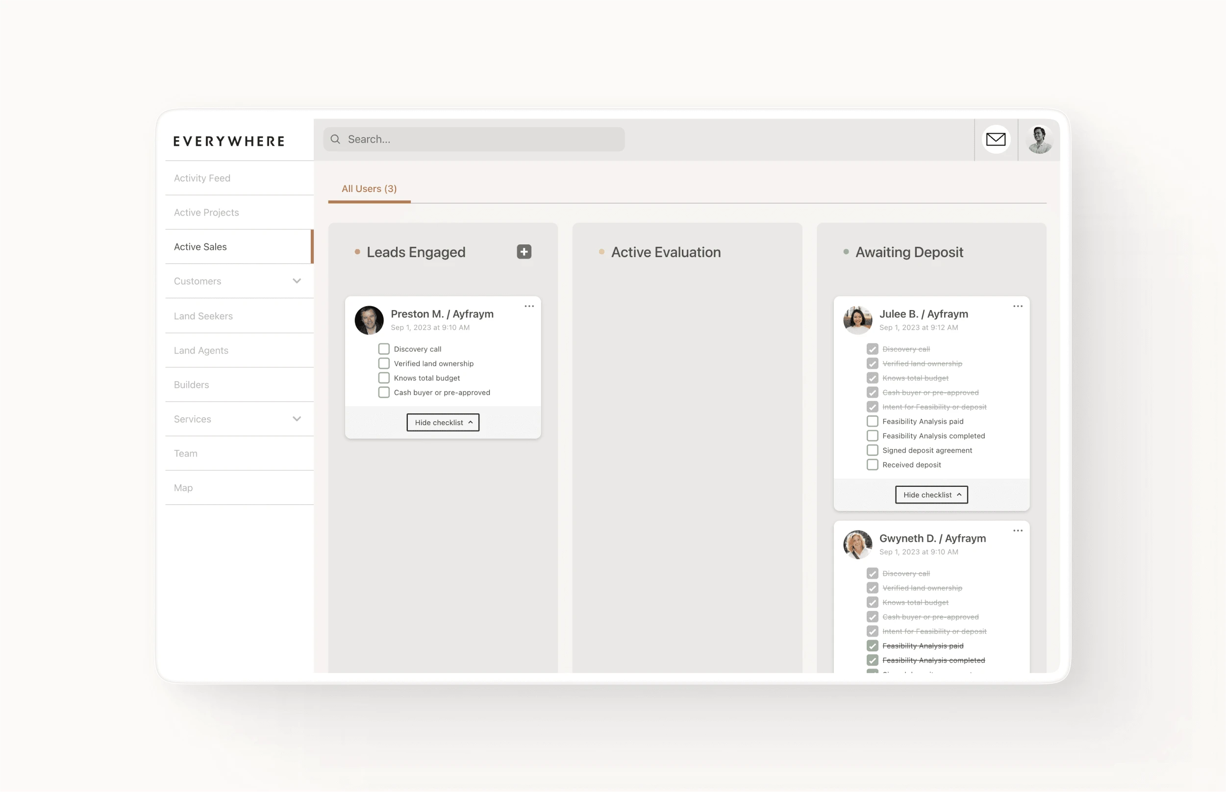 Everywhere specializes in offering plans and services for building small-footprint, nature-based homes at scale. We partnered with them to create a custom platform to streamline their lead management and business processes.