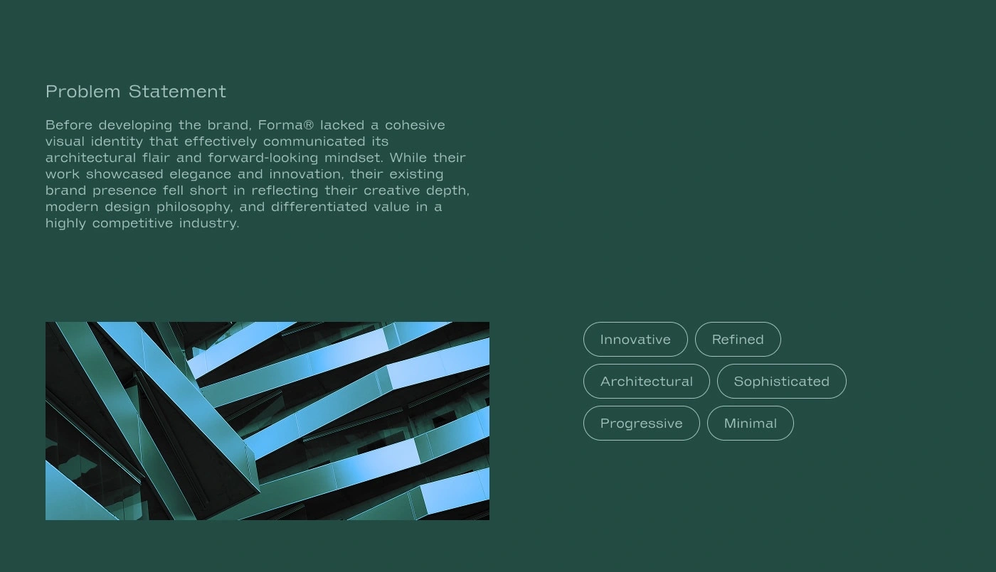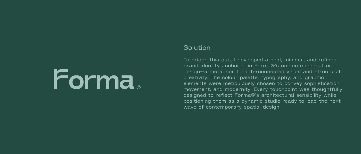 Elevating Forma® , an Architect & Design Studio established in 2023, demanded a modern visual identity reflective of its innovative ethos. Embracing their USP of mesh pattern design, we crafted a dynamic brand persona. Our focus on advancement resonated with their mission to deliver contemporary spaces for modern lifestyles. This collaboration culminated in a vibrant, forward-thinking brand identity, poised to captivate audiences and drive Forma® 's success.