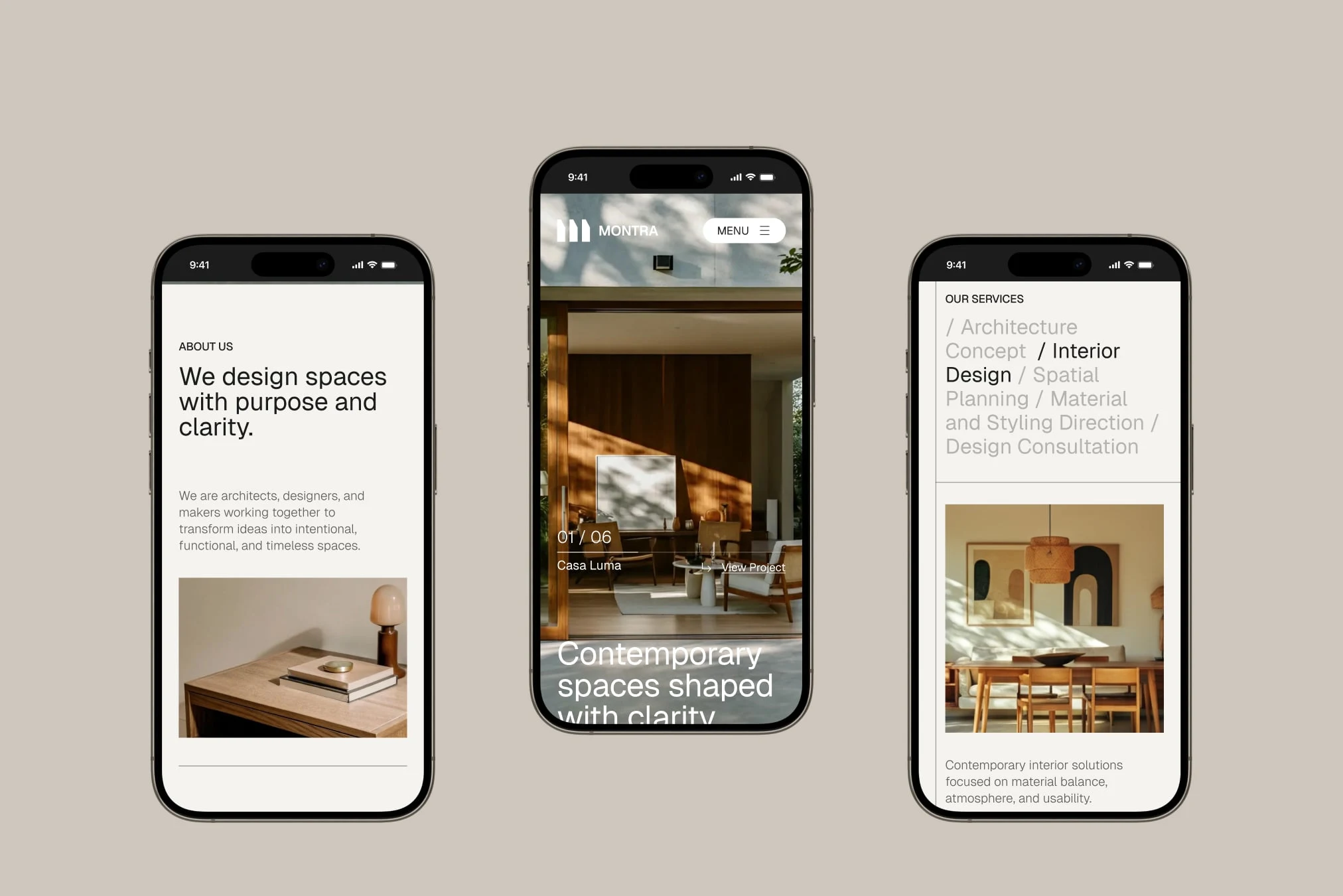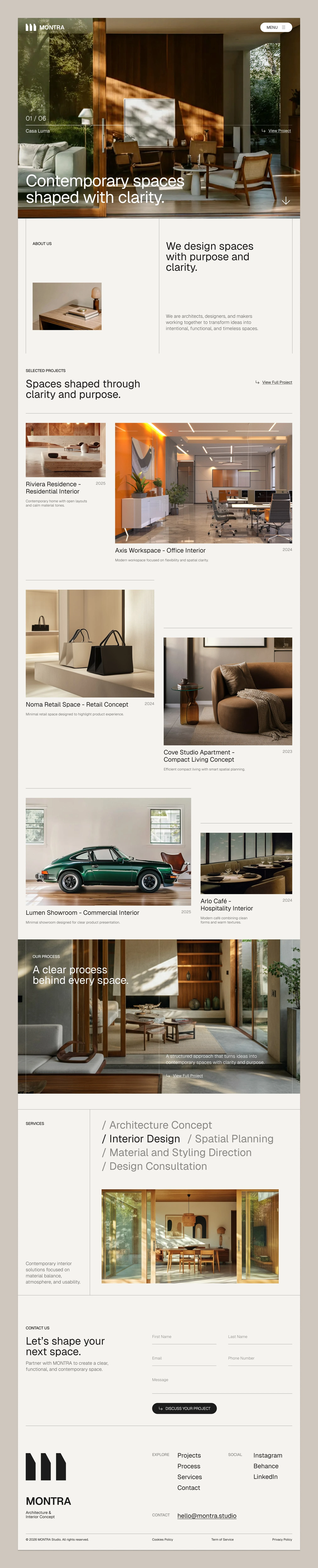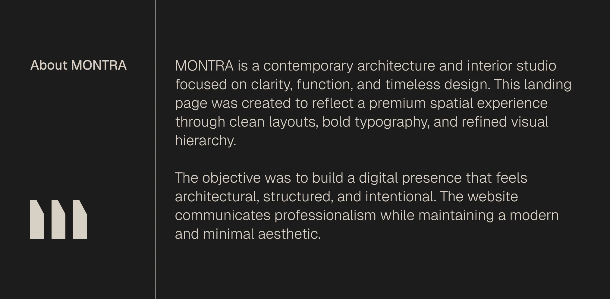 This landing page was designed to represent MONTRA as a contemporary architecture and interior studio with a clear, precise, and modern approach.