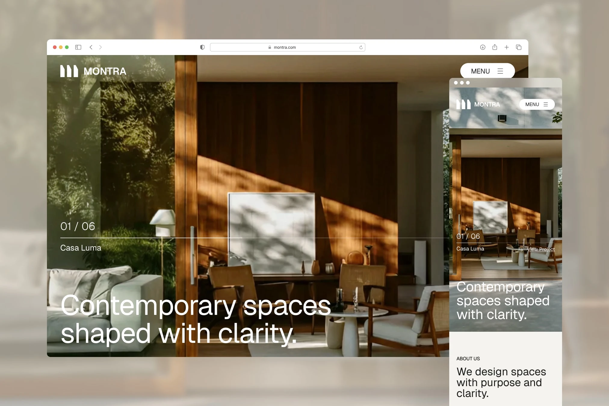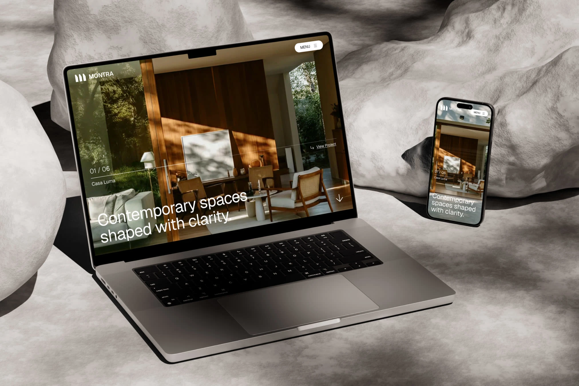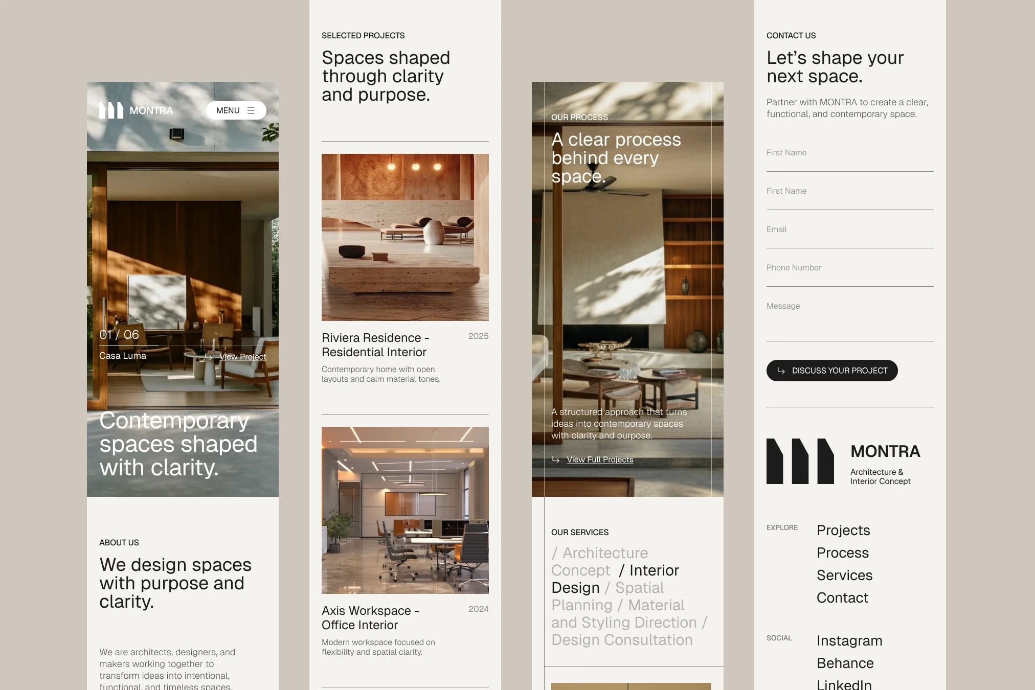 This landing page was designed to represent MONTRA as a contemporary architecture and interior studio with a clear, precise, and modern approach.