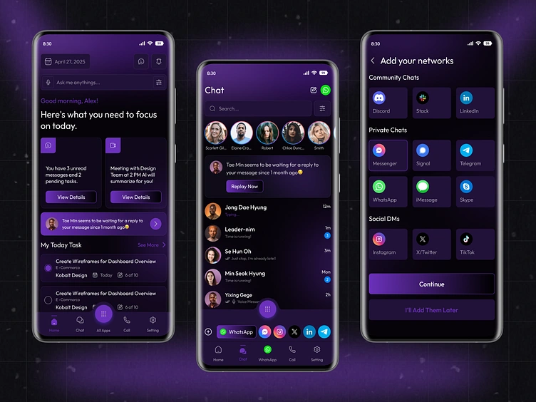 1. Overview: A modern and intuitive mobile app concept designed to connect people through seamless communication and social sharing. This UI/UX focuses on simplicity, speed, and social engagement.