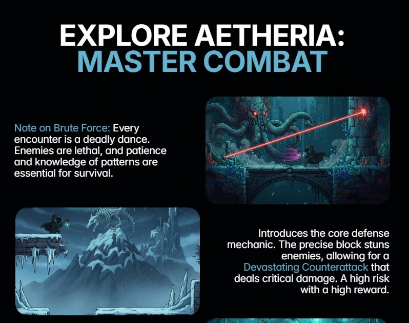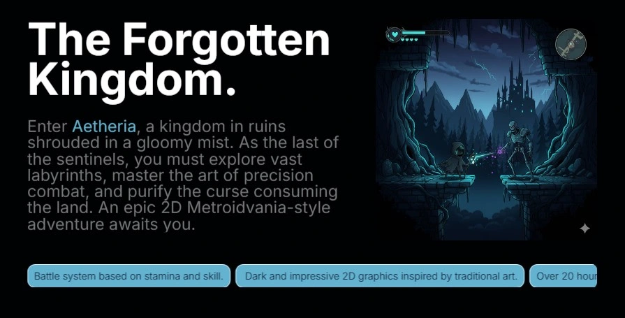 Conceptual website for Aetheria, a 2D indie videogame. Designed and developed from scratch in Framer.