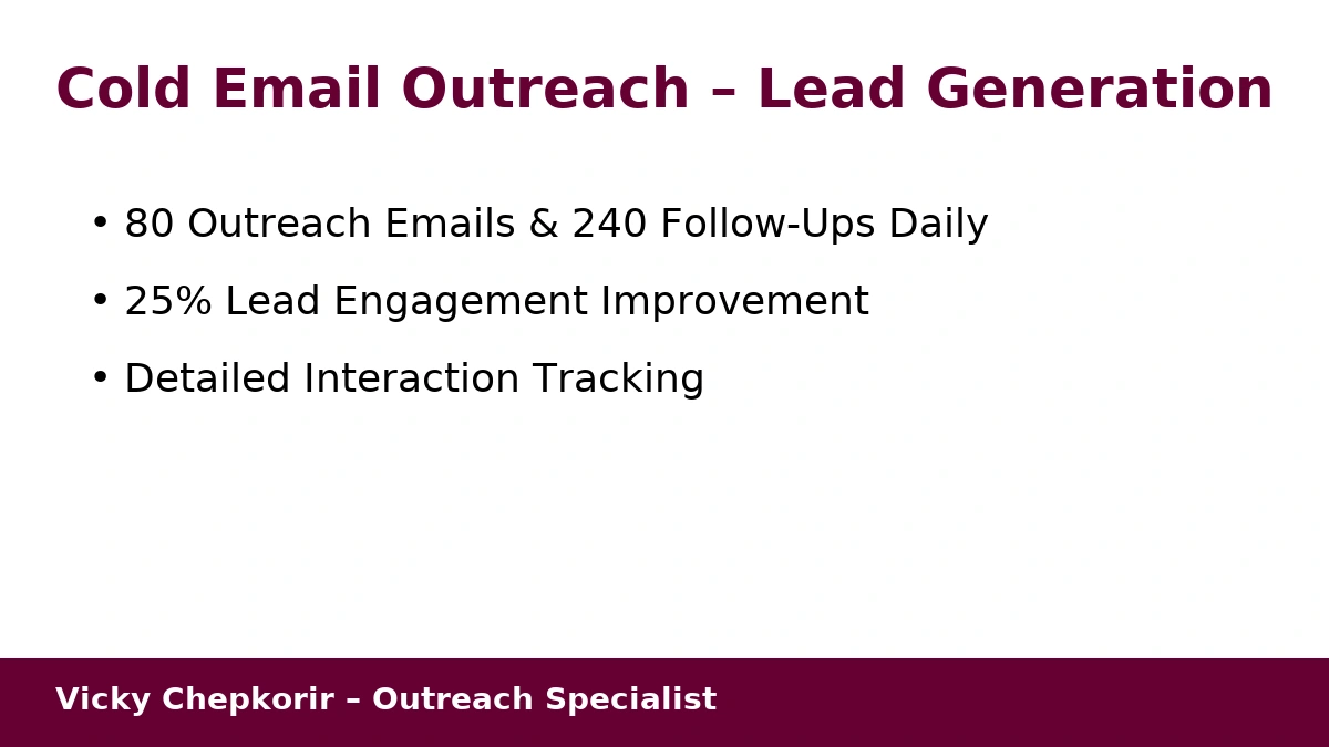 Executed a structured outreach strategy, sending personalized emails daily to potential clients and following up with a 3-stage nurture process