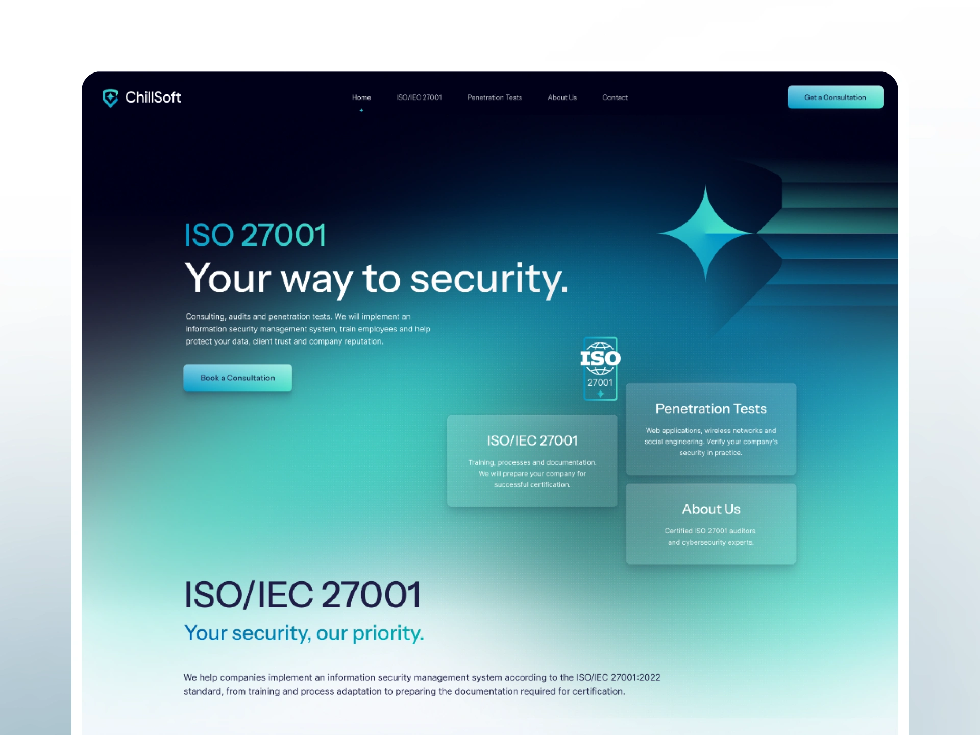 A complete digital transformation for a company specializing in ISO 27001 security standards. I crafted a distinct visual identity, from the logo to the color palette, and developed a custom WordPress website. The design employs a modern, light-dark aesthetic to convey technical expertise, creating a platform that feels both cutting-edge and authoritative.