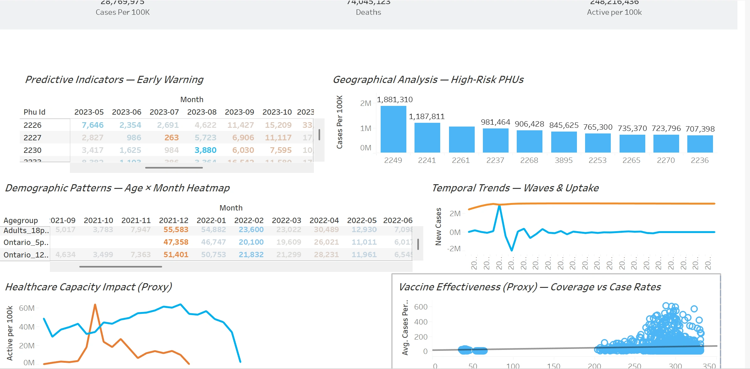 Ontario’s Public Health Units (PHUs) experienced uneven COVID-19 case surges and vaccination uptake during the pandemic, influenced by geography, demographics, and socioeconomic conditions. Despite widespread vaccination campaigns, certain regions and age groups continued to face disproportionate infection rates and healthcare pressures. This raises critical questions about the effectiveness of vaccination programs, equity in health outcomes, and the ability to predict and manage future waves. Without a data-driven understanding of these patterns, resource allocation and policy responses risk being reactive rather than proactive.