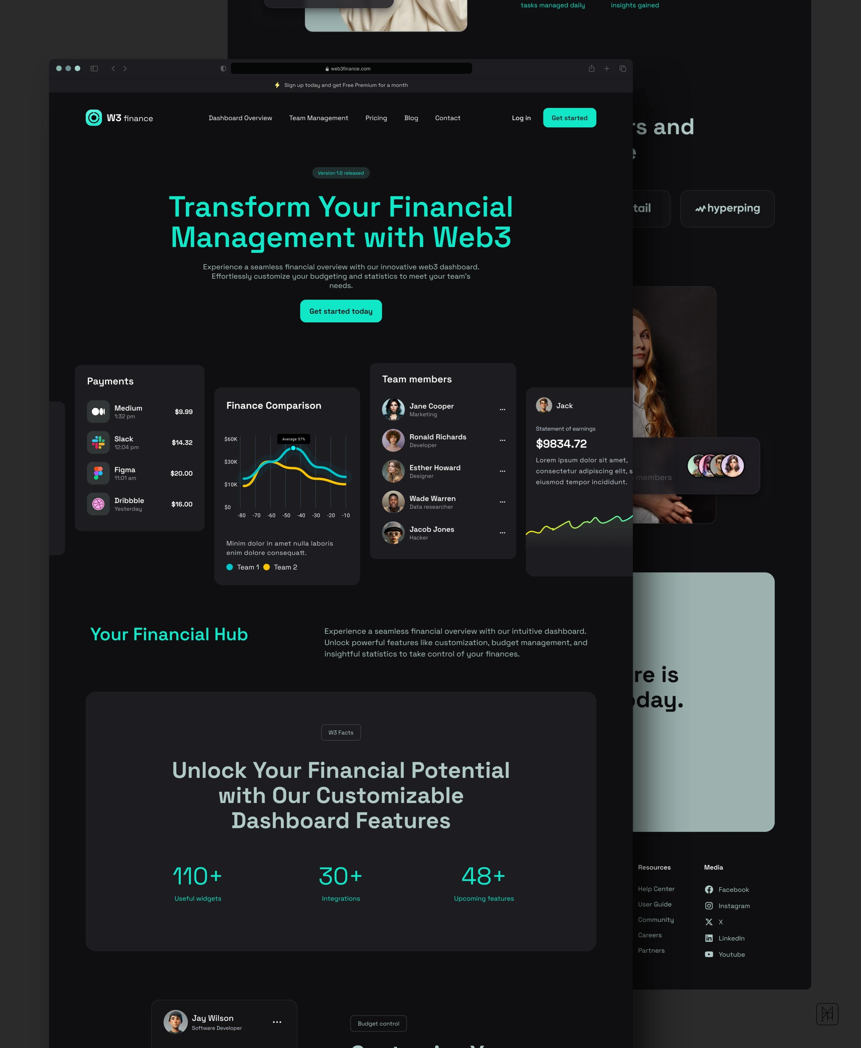 Design of a website for Web3 Finance company that provides financial analytics, team management and other key performance tools.
