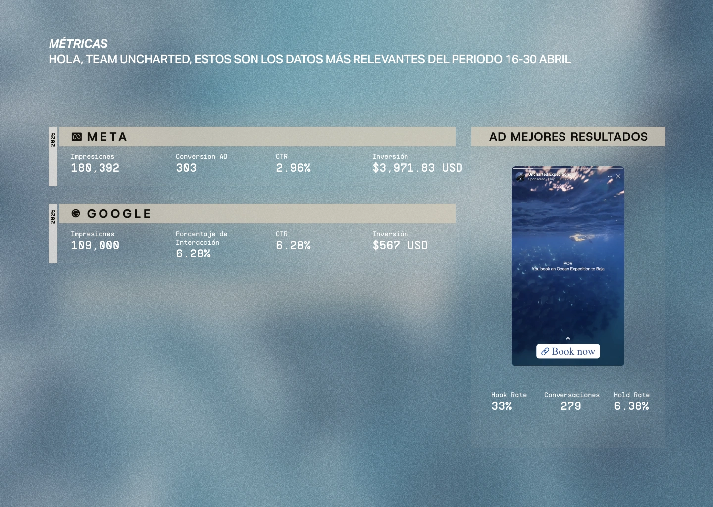 Boosted Uncharted’s results with high-impact Meta and Google campaigns: 289K+ impressions, strong CTRs, and 279 conversations using data-driven ads.