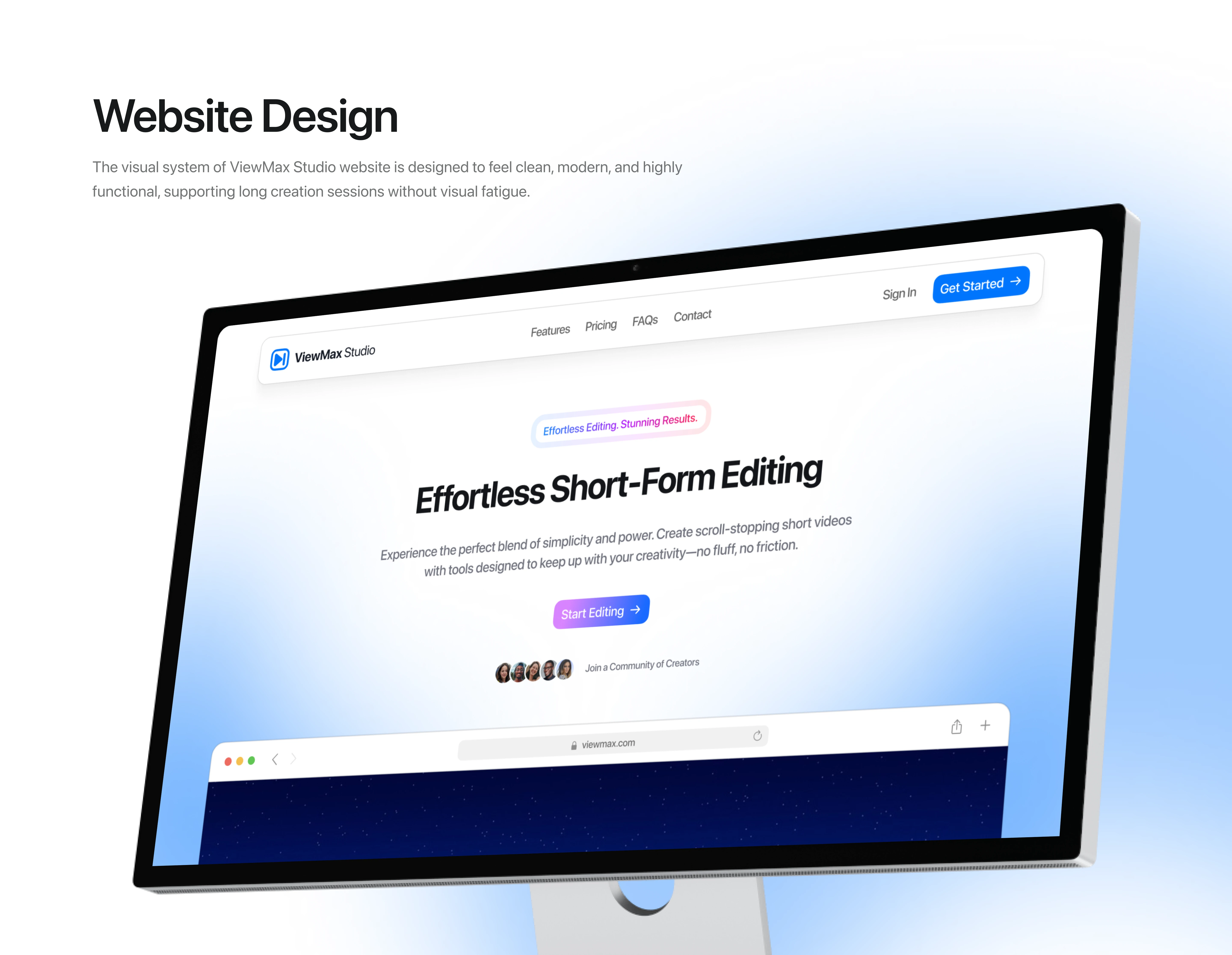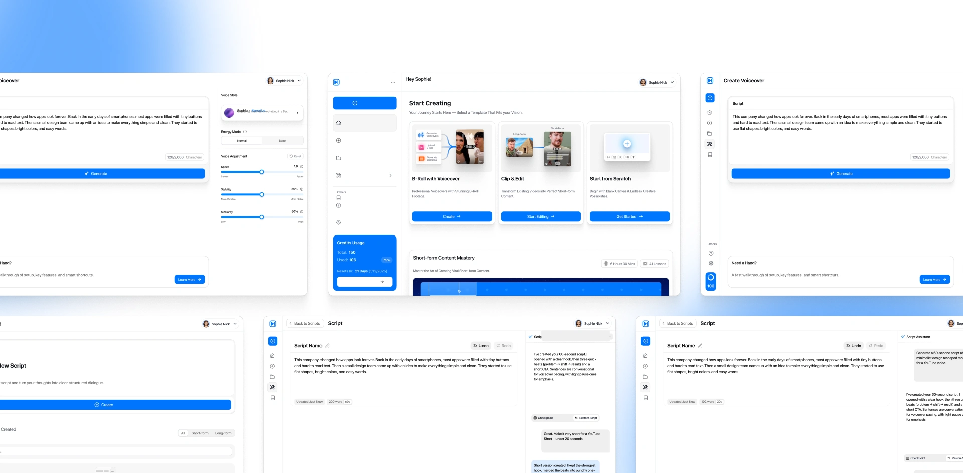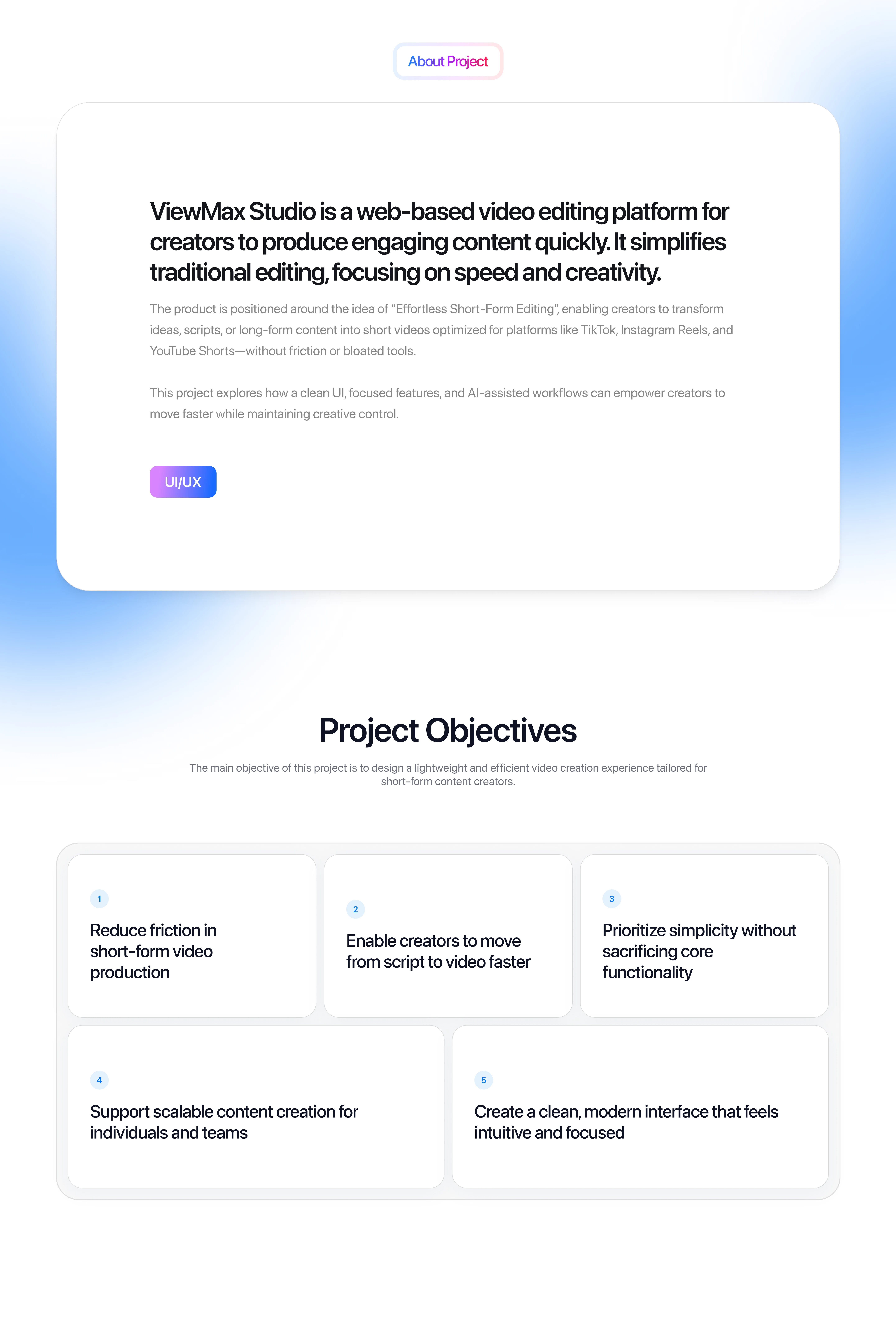 The project began with defining the core user flows and product structure, followed by wireframes to validate speed and usability. We then designed the final UI with a clean, modern aesthetic and clear hierarchy, supported by AI-assisted workflows that help creators turn scripts or long-form content into short videos optimized for platforms like TikTok, Instagram Reels, and YouTube Shorts.