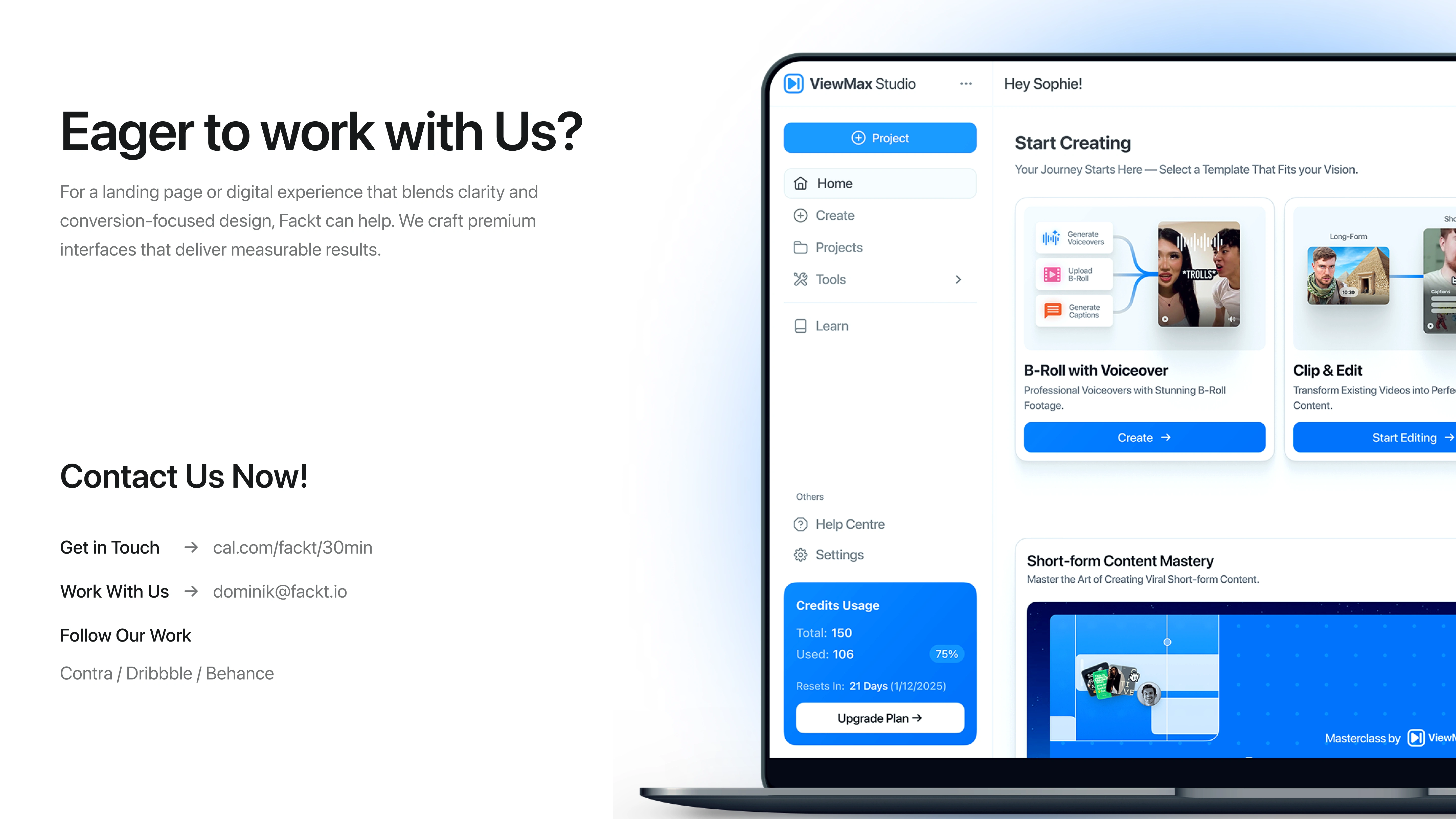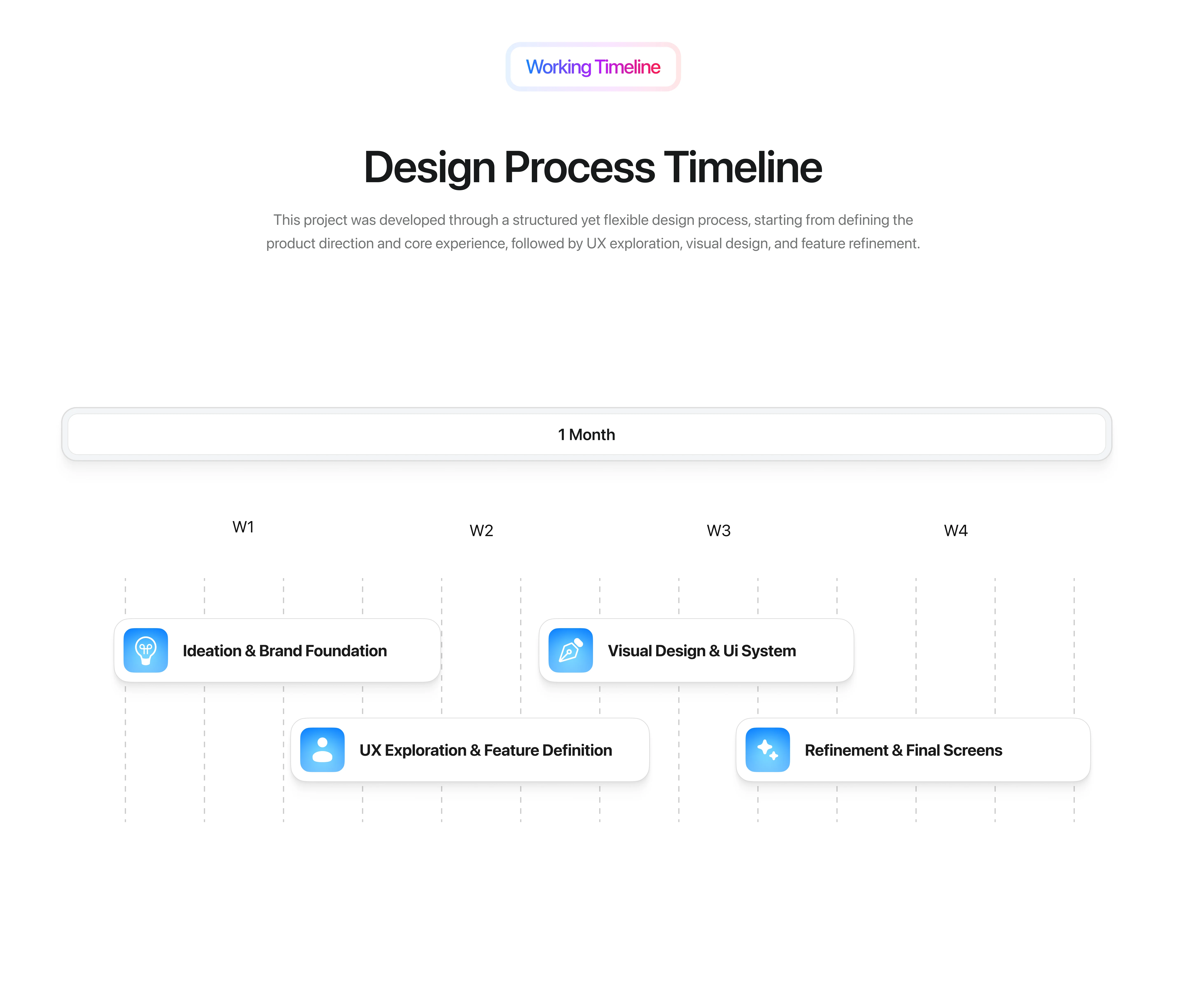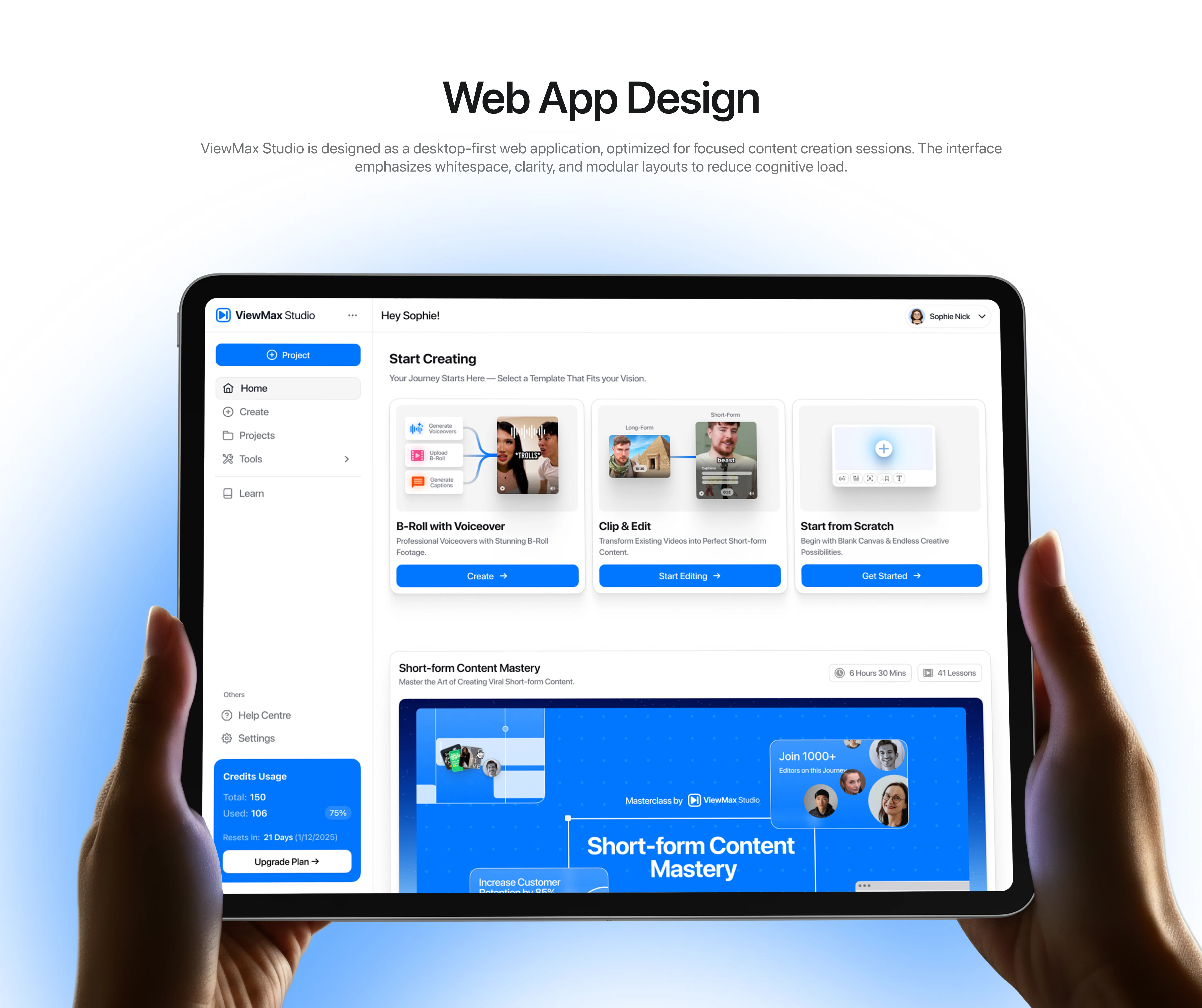 The project began with defining the core user flows and product structure, followed by wireframes to validate speed and usability. We then designed the final UI with a clean, modern aesthetic and clear hierarchy, supported by AI-assisted workflows that help creators turn scripts or long-form content into short videos optimized for platforms like TikTok, Instagram Reels, and YouTube Shorts.
