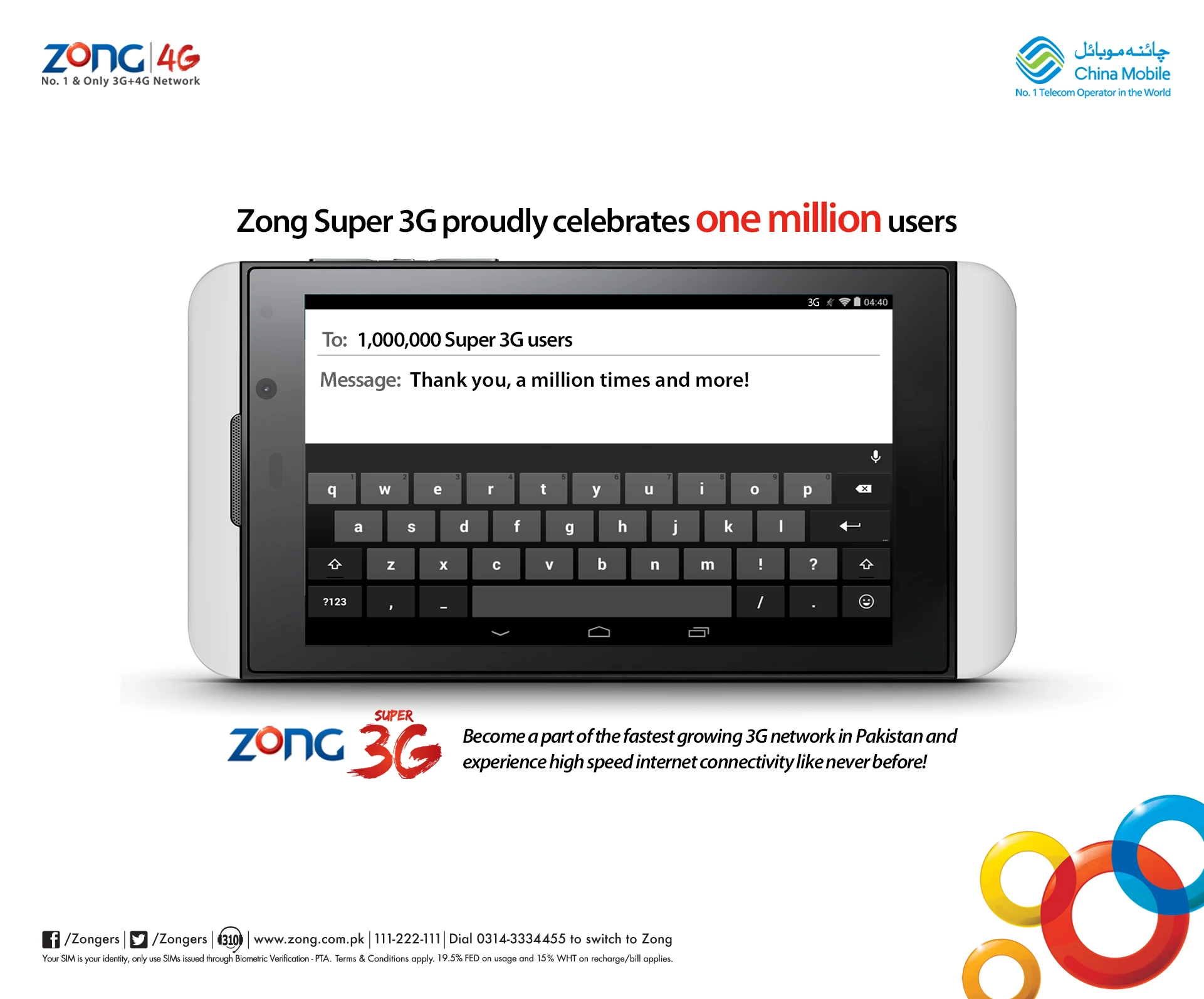 A newspaper print ad to thank & celebrate One Million Zong Super 3G Customers.