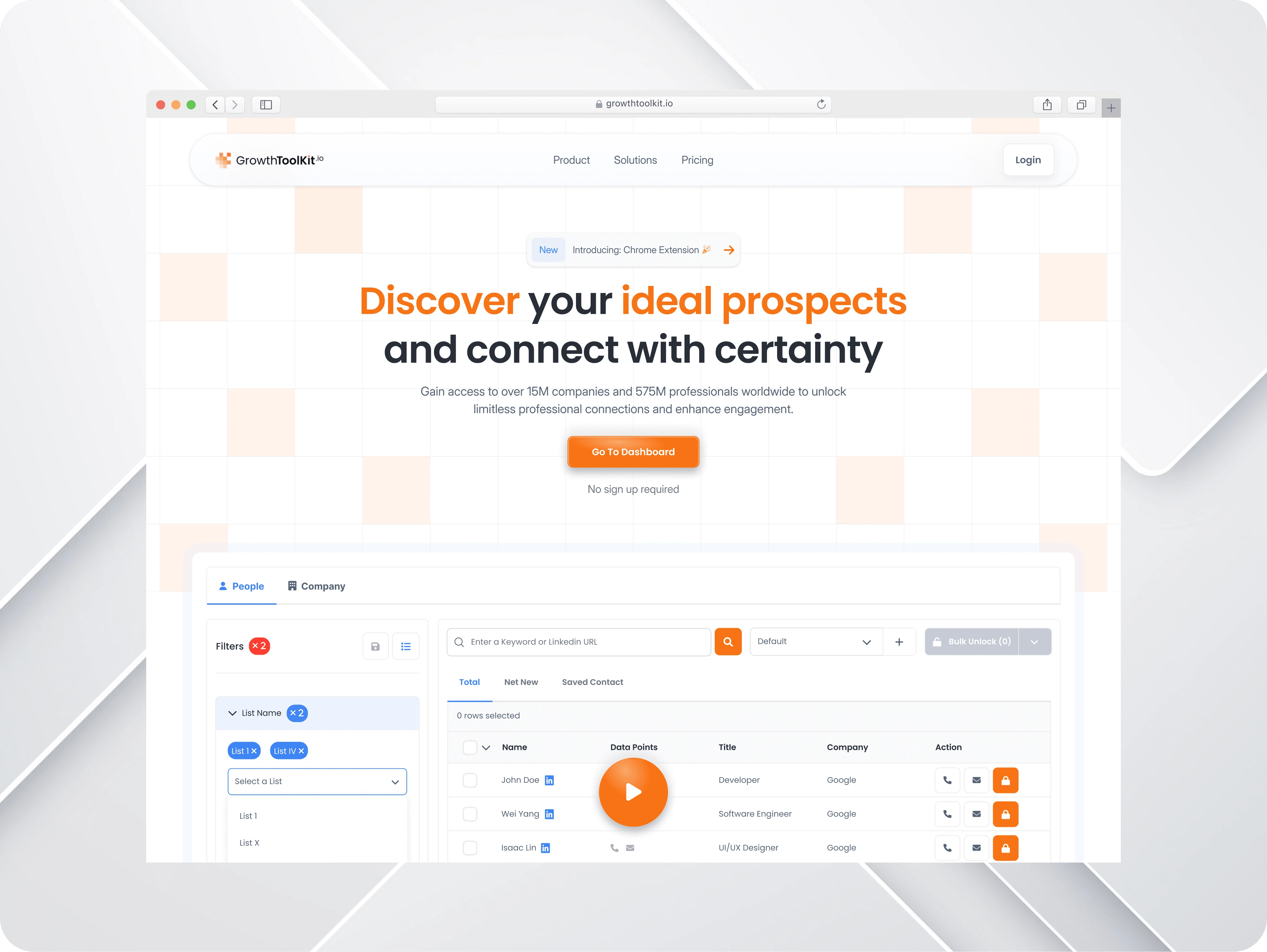 Led end-to-end design for a SaaS prospecting platform that acquired 1,000+ paying users within three weeks of launch.