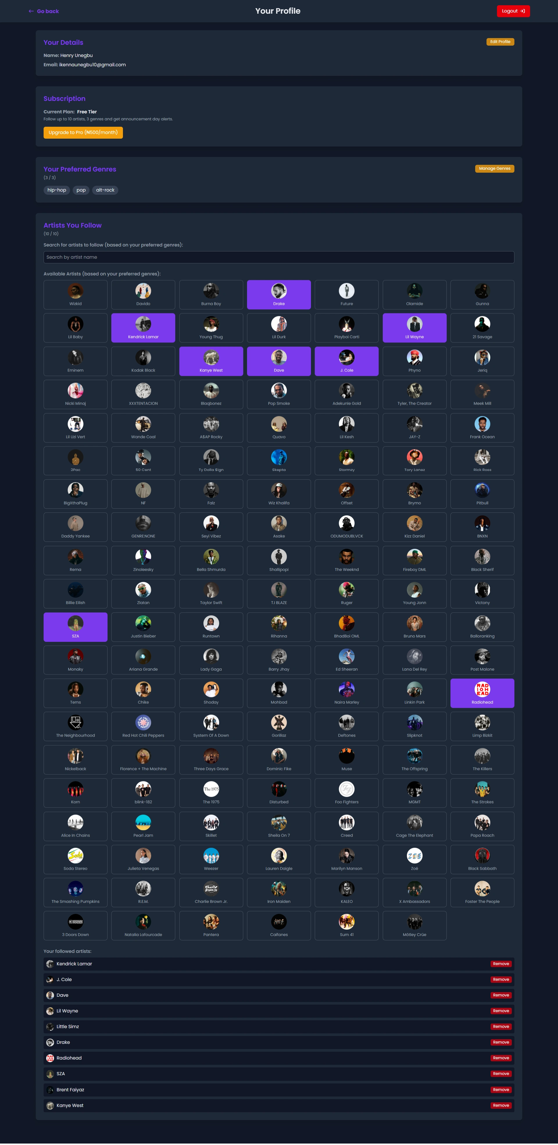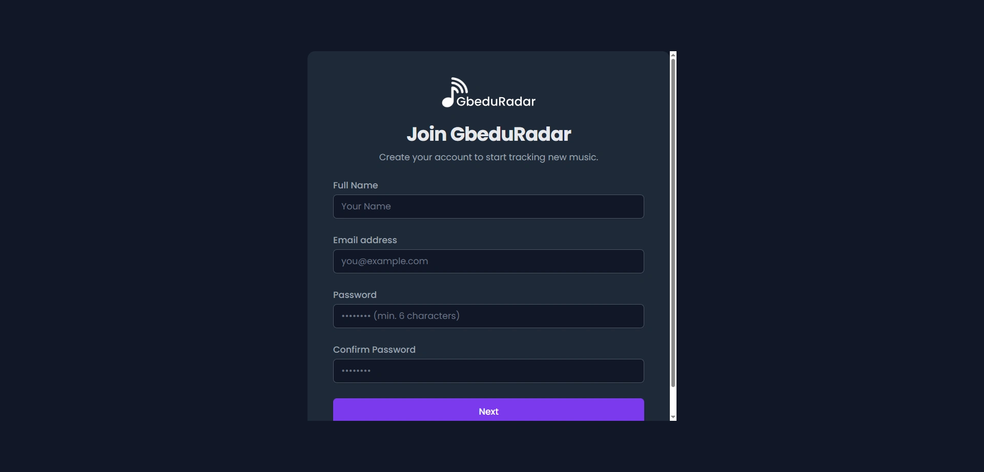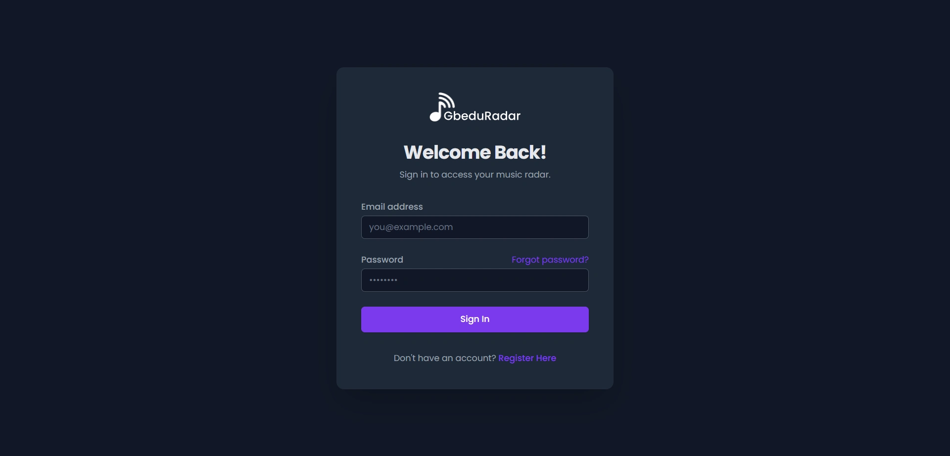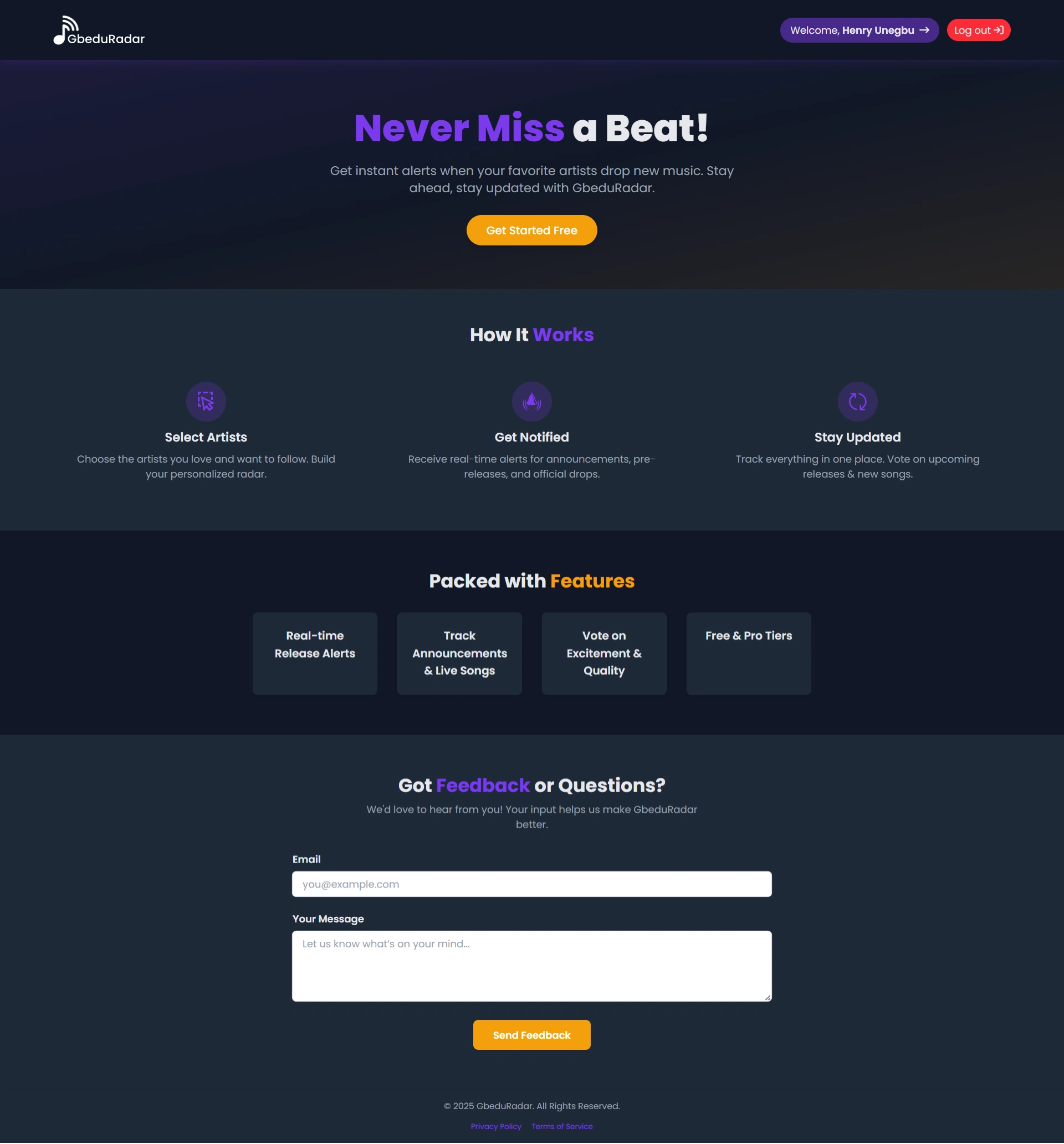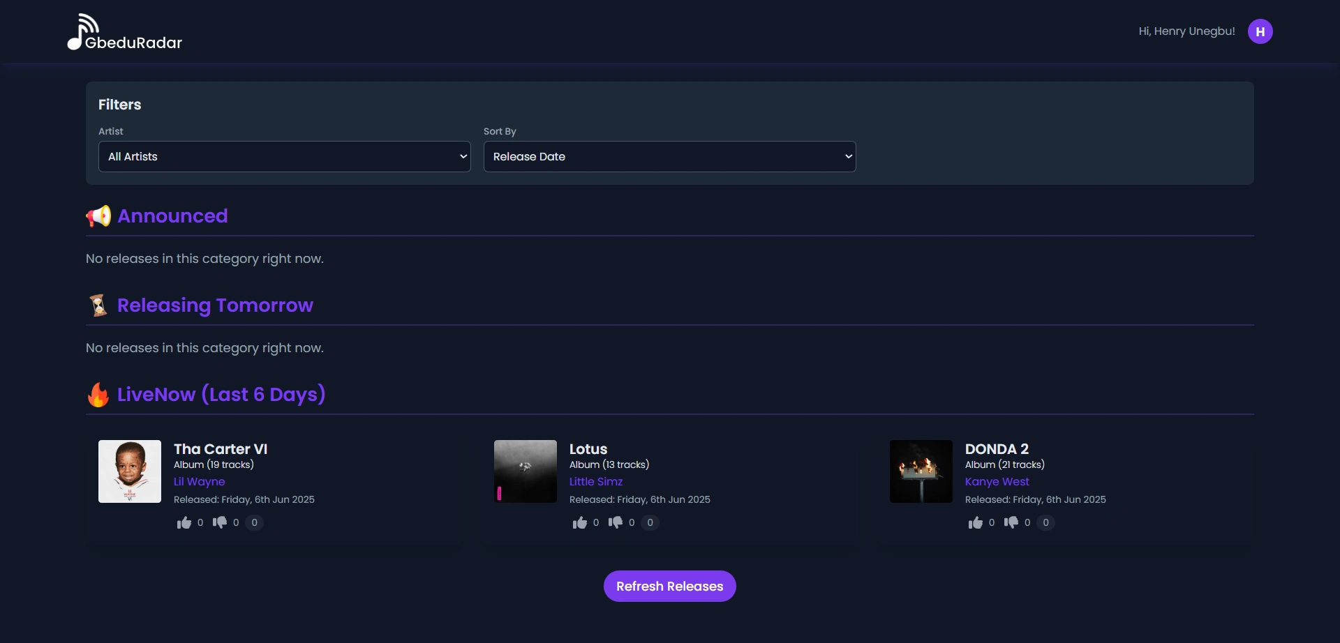 My goal for GbeduRadar was to create a user-friendly web application that streamlines how I and other music fans discover and track new song and album releases. This platform offers features like personalized artist following, automated release notifications, and community voting on tracks.