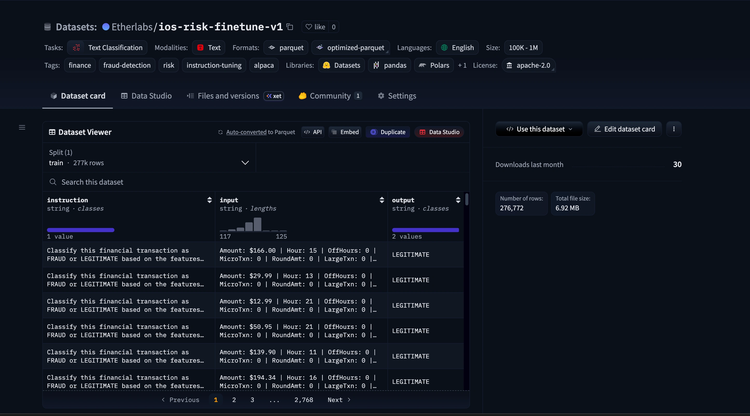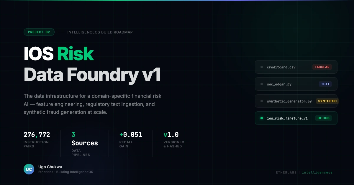 foundry/features/tabular_features.py)foundry/sources/sec_edgar.py)foundry/sources/synthetic_generator.py)risk_explanation field — the LLM's training target for learning to reason about fraud, not just classify it.foundry/pipeline.py) processes all three sources, merges and deduplicates (276,772 final pairs after removing 18,035 duplicates), shuffles, and exports to HuggingFace Hub as a versioned Parquet dataset.foundry-v1.0 with SHA256 hashes in dataset_manifest.json for full reproducibility.foundry-v1.0 git tag