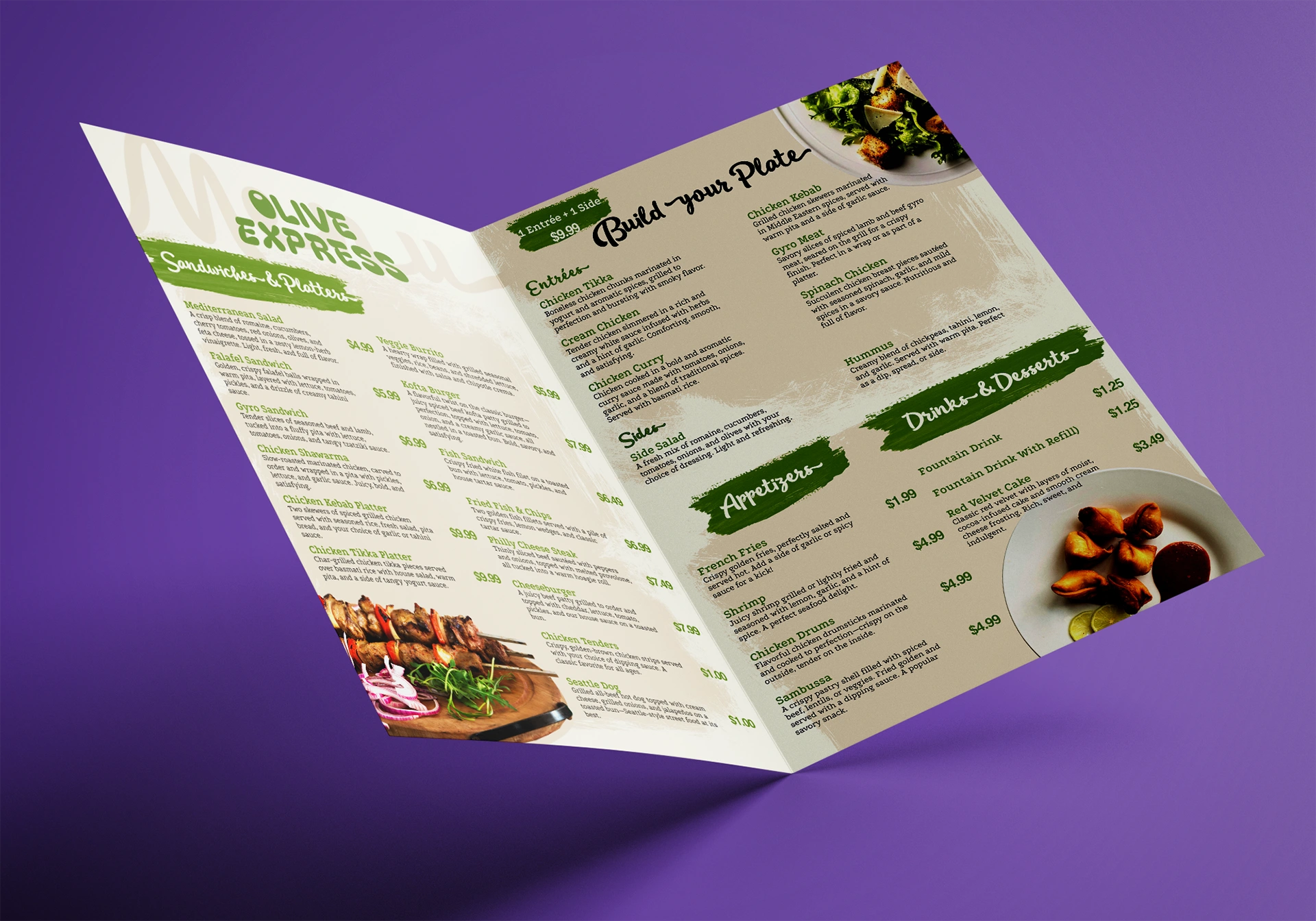 This project was all about capturing the essence of Olive Express. A family-friendly Mediterranean fast food restaurant with a modern twist. The goal was to create a visual identity that felt approachable, vibrant, and healthy. From the logo to the menu layout, every element was designed with clean lines, soft earthy tones, and food-forward imagery to appeal to families, busy professionals, and anyone craving a flavorful, quick meal without sacrificing quality.