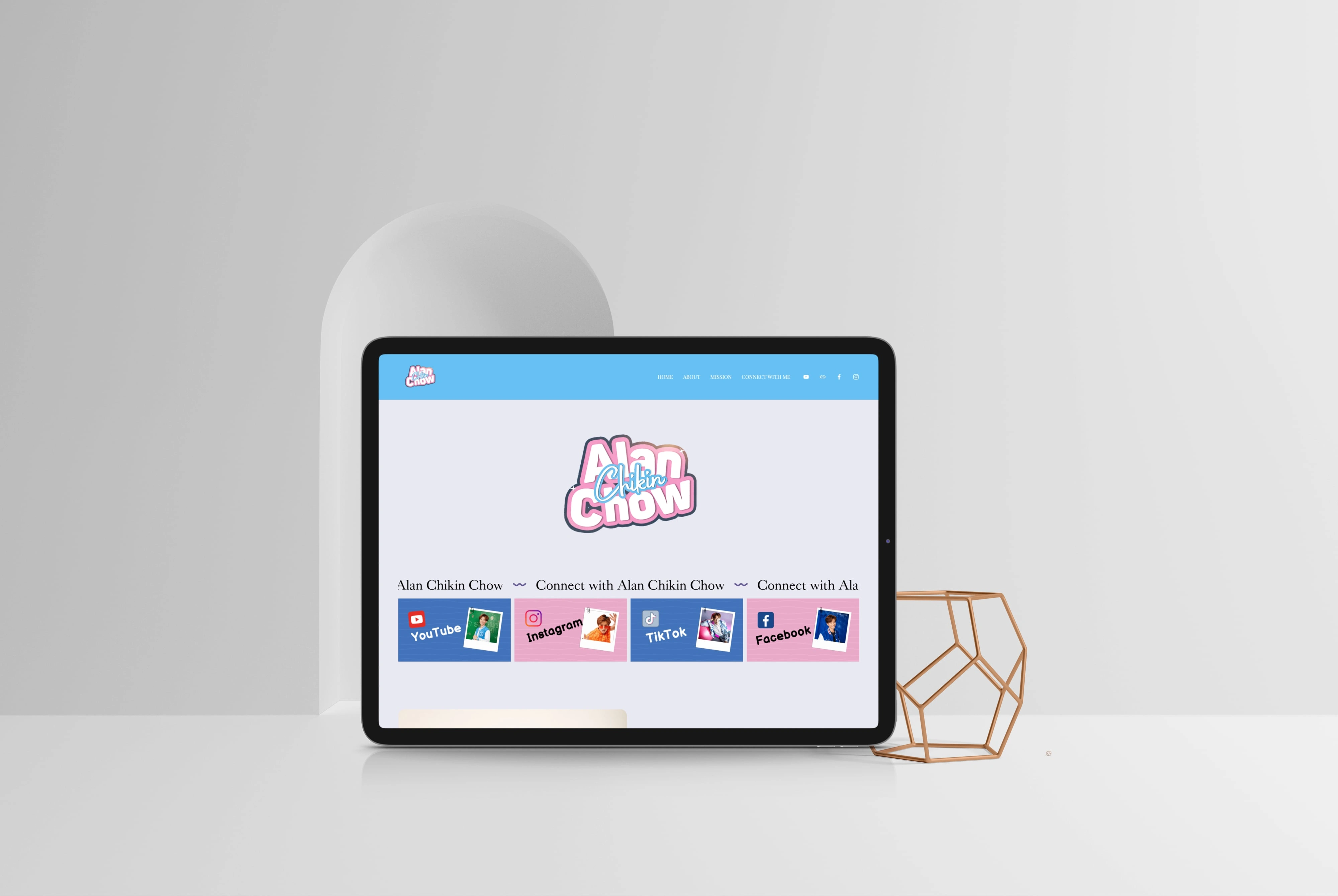 Alan Chikin Chow The “Mission” area positions his creative philosophy (“uniting audiences through laughter & storytelling”), while “Connect” modules direct fans to social platforms and contact channels with seamless flow.