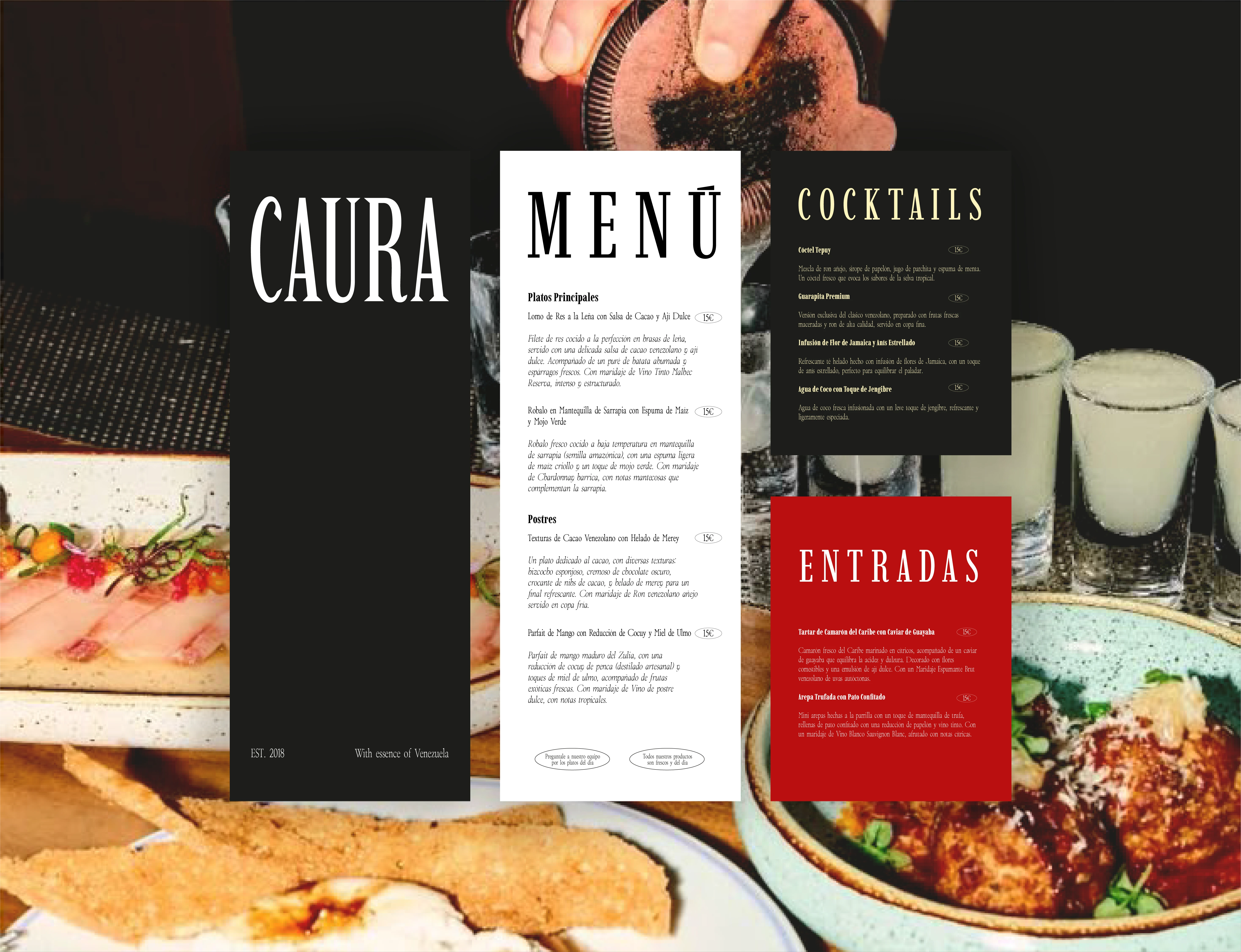 Caura: branding para un restaurante de lujo que fusiona la alta gastronomía con raíces venezolanas, tradición indígena y una estética contemporánea.