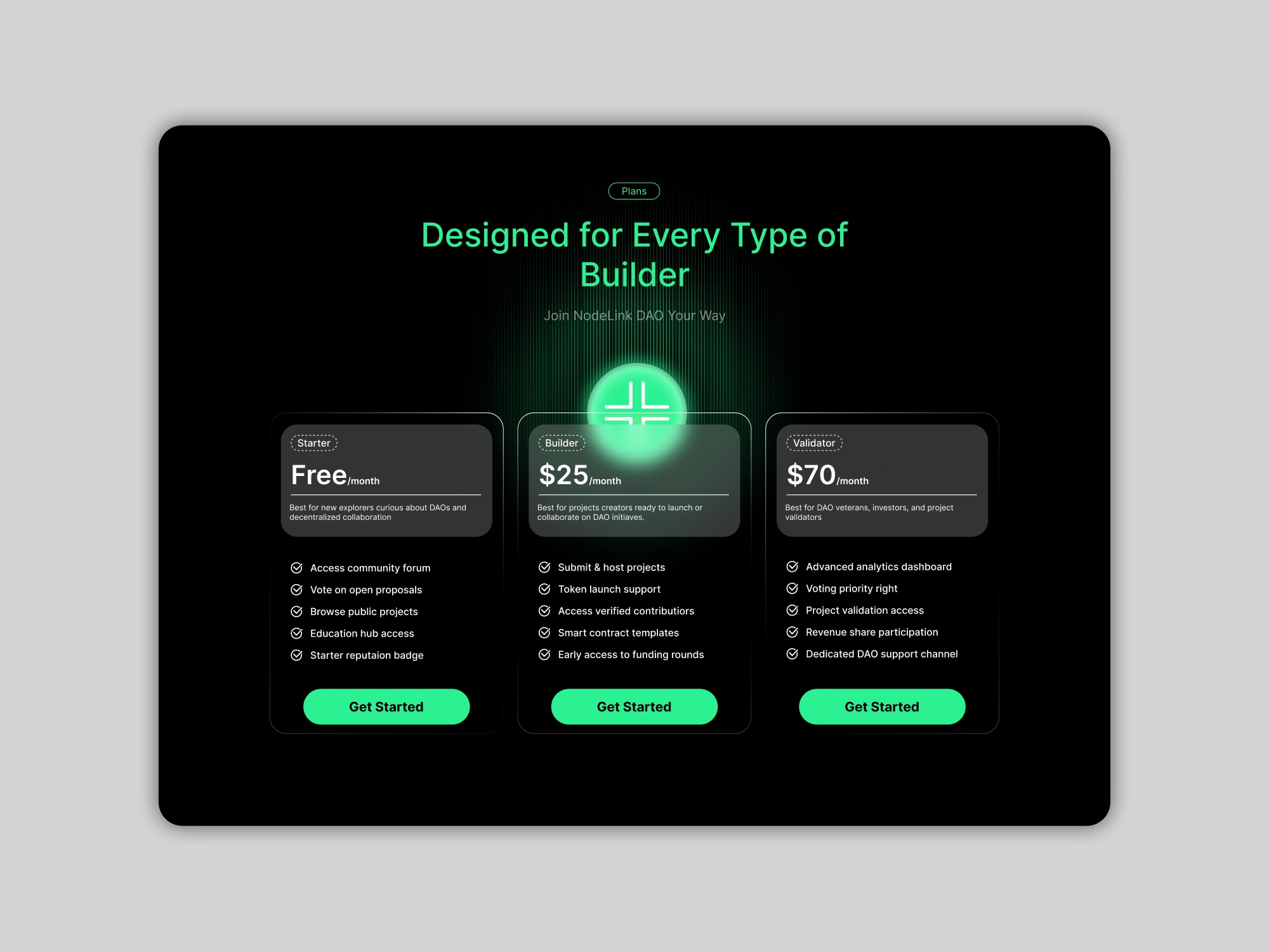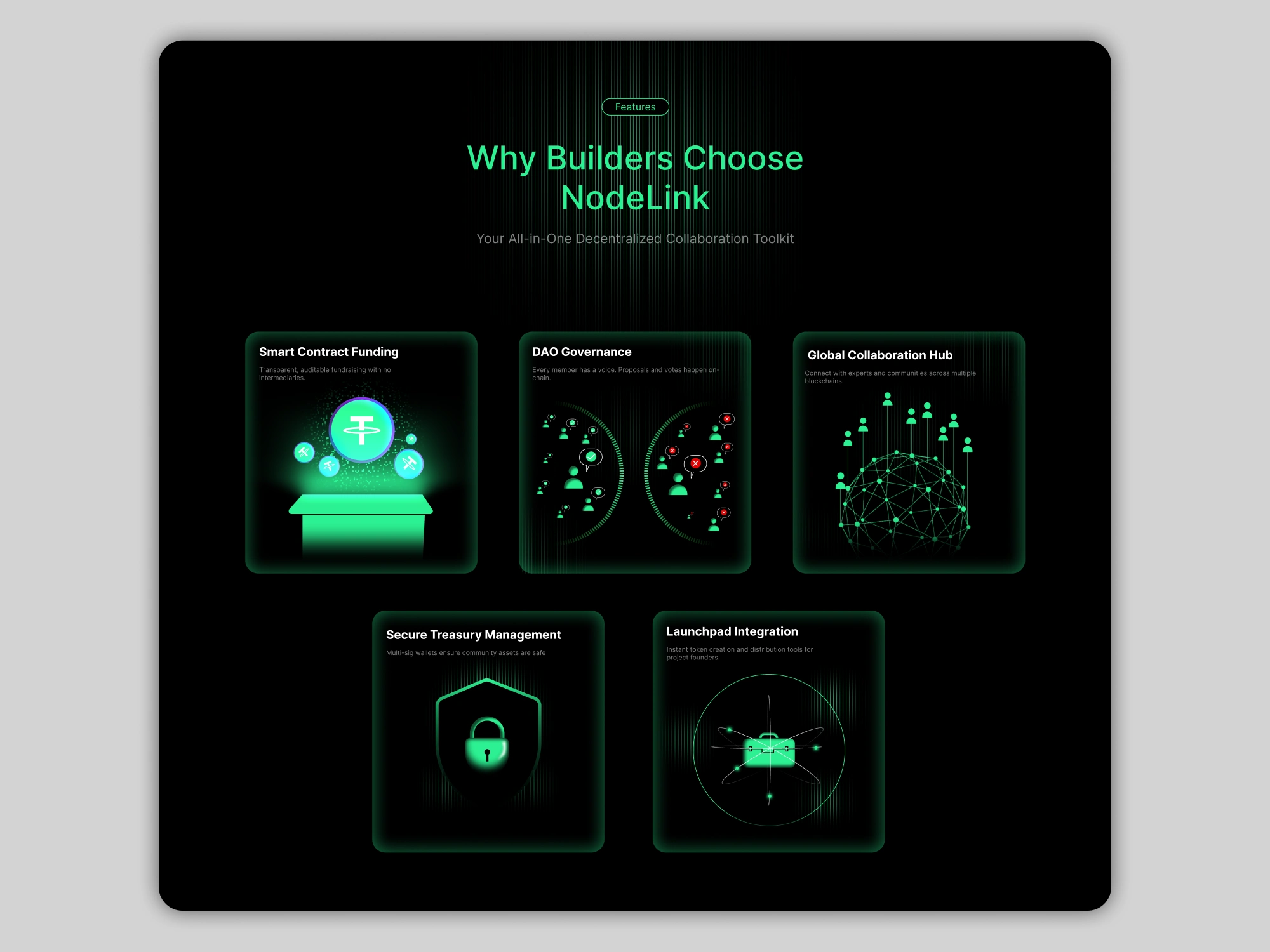 NodeLink is a community-powered Web3 platform designed to enable builders, investors, and creators to collaborate, launch, and grow projects transparently. The goal of this project was to create a modern landing page that communicates decentralization, trust, and innovation while simplifying complex Web3 concepts for a broader audience.