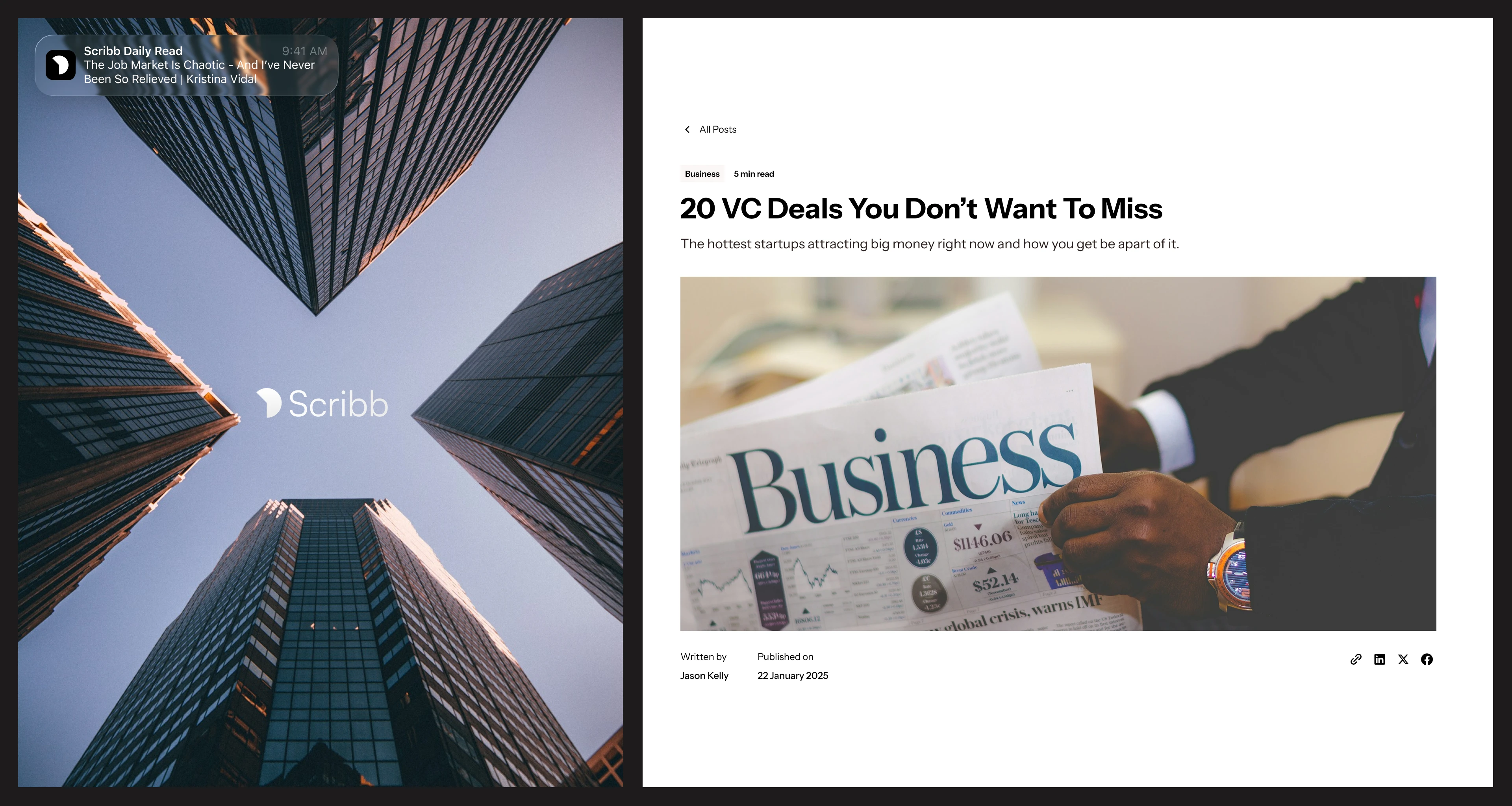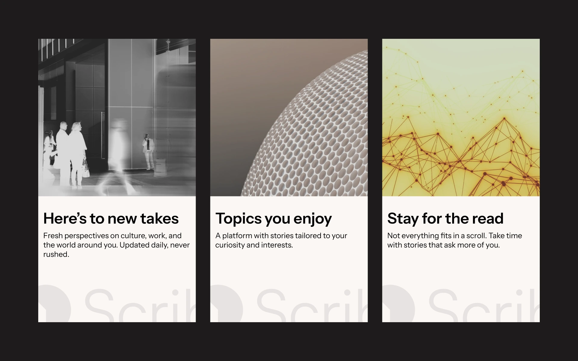 In a saturated landscape of content platforms, Scribb needed to establish a distinct identity without relying on trends or excess. Many competitors lean either toward rigid, utility-driven interfaces or overly social, attention-demanding environments. Scribb required a more balanced approach, something that could feel editorial without becoming exclusive and expressive without becoming chaotic.
