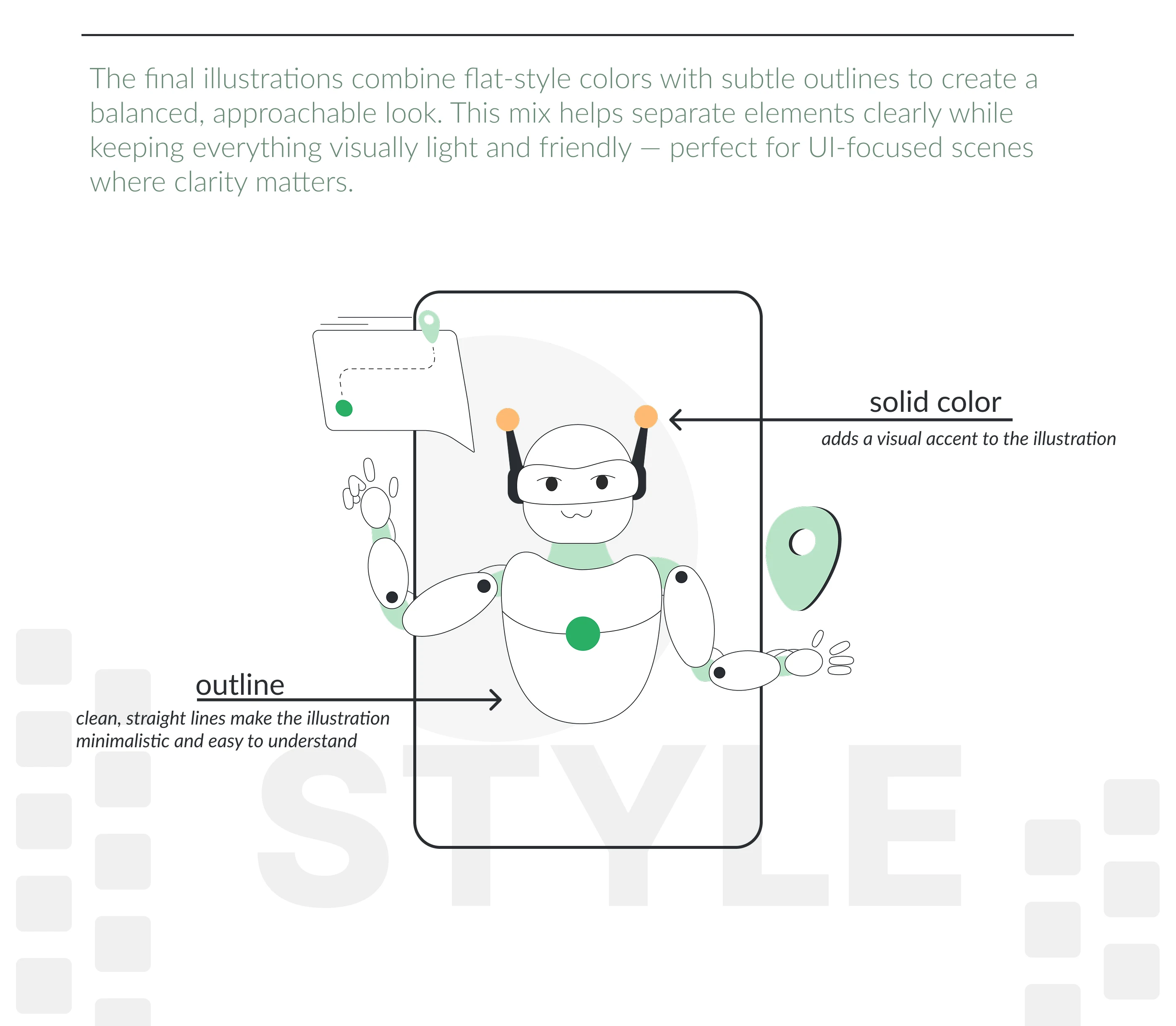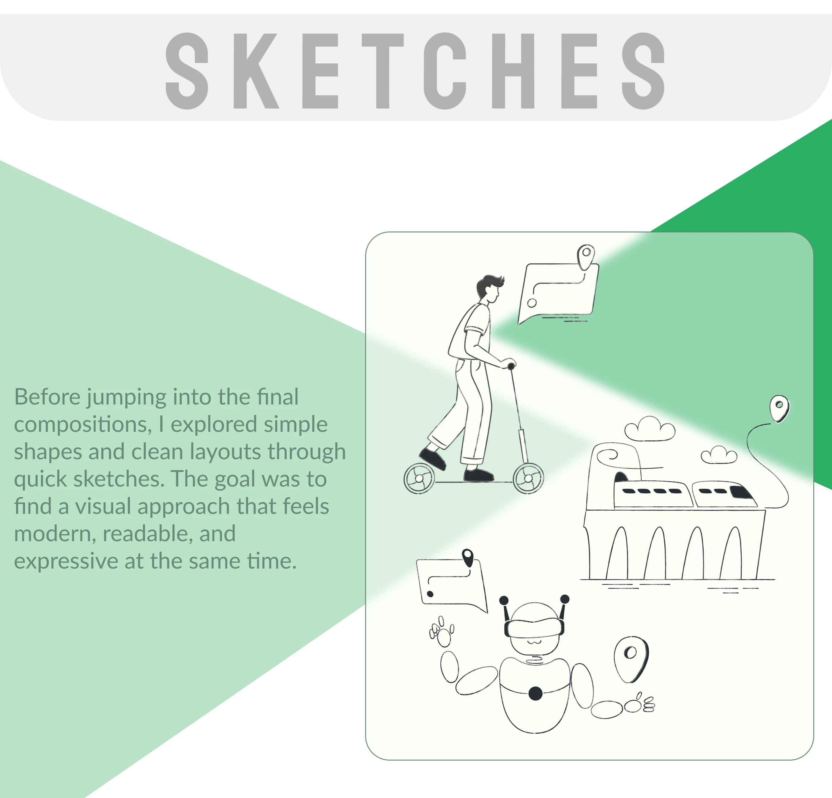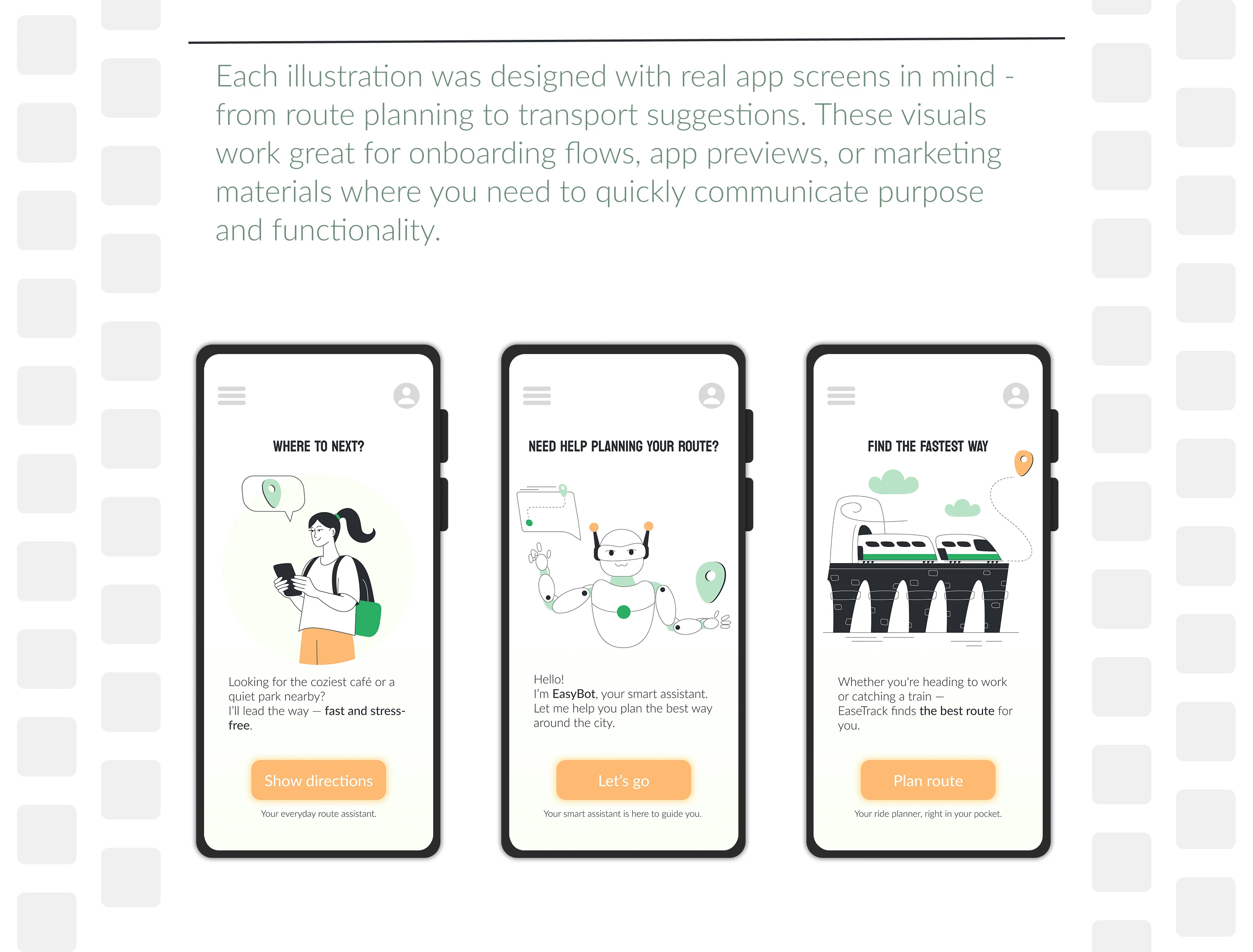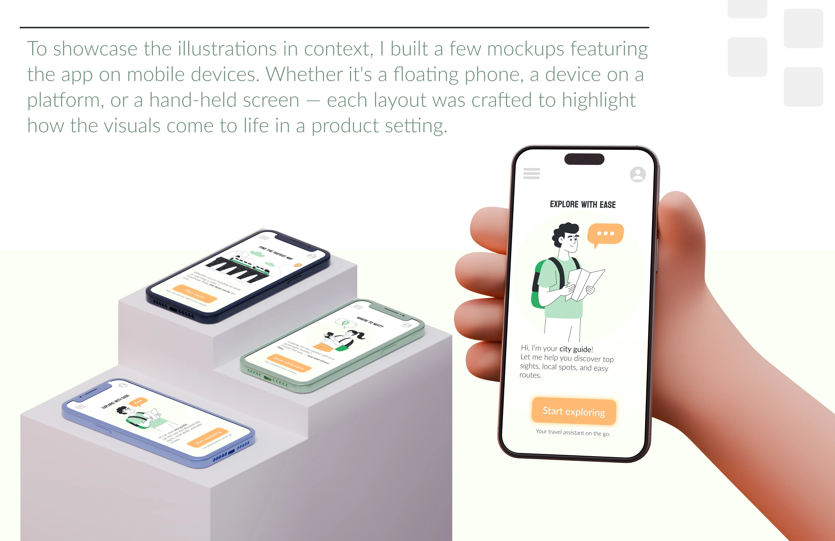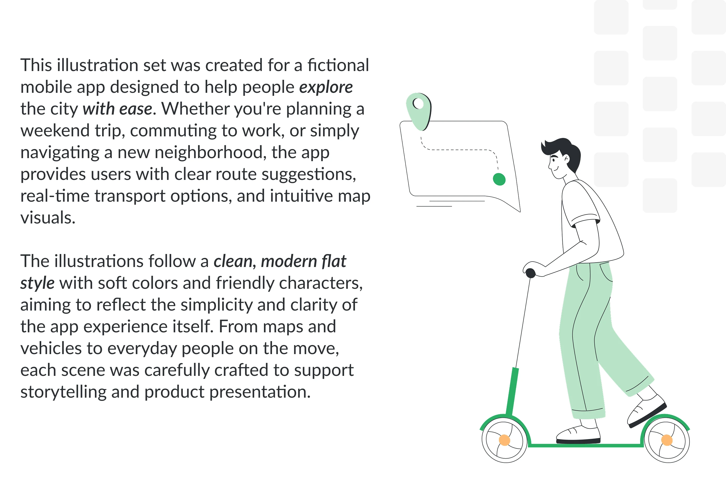 Flat-style illustrations for a smart city app — friendly visuals for onboarding, navigation, and features, with custom mockups and UI-focused design.