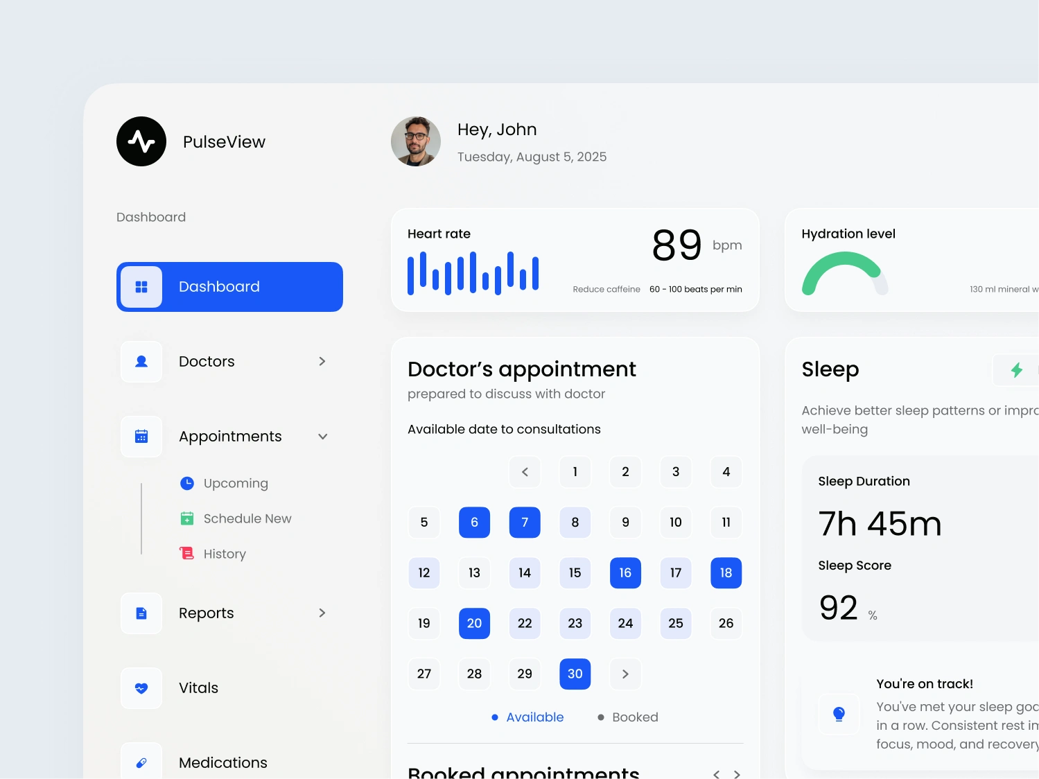 A seamless overview of your health at a glance. From booking doctor appointments to tracking sleep quality and medication schedules, this dashboard is designed to simplify personal wellness management.