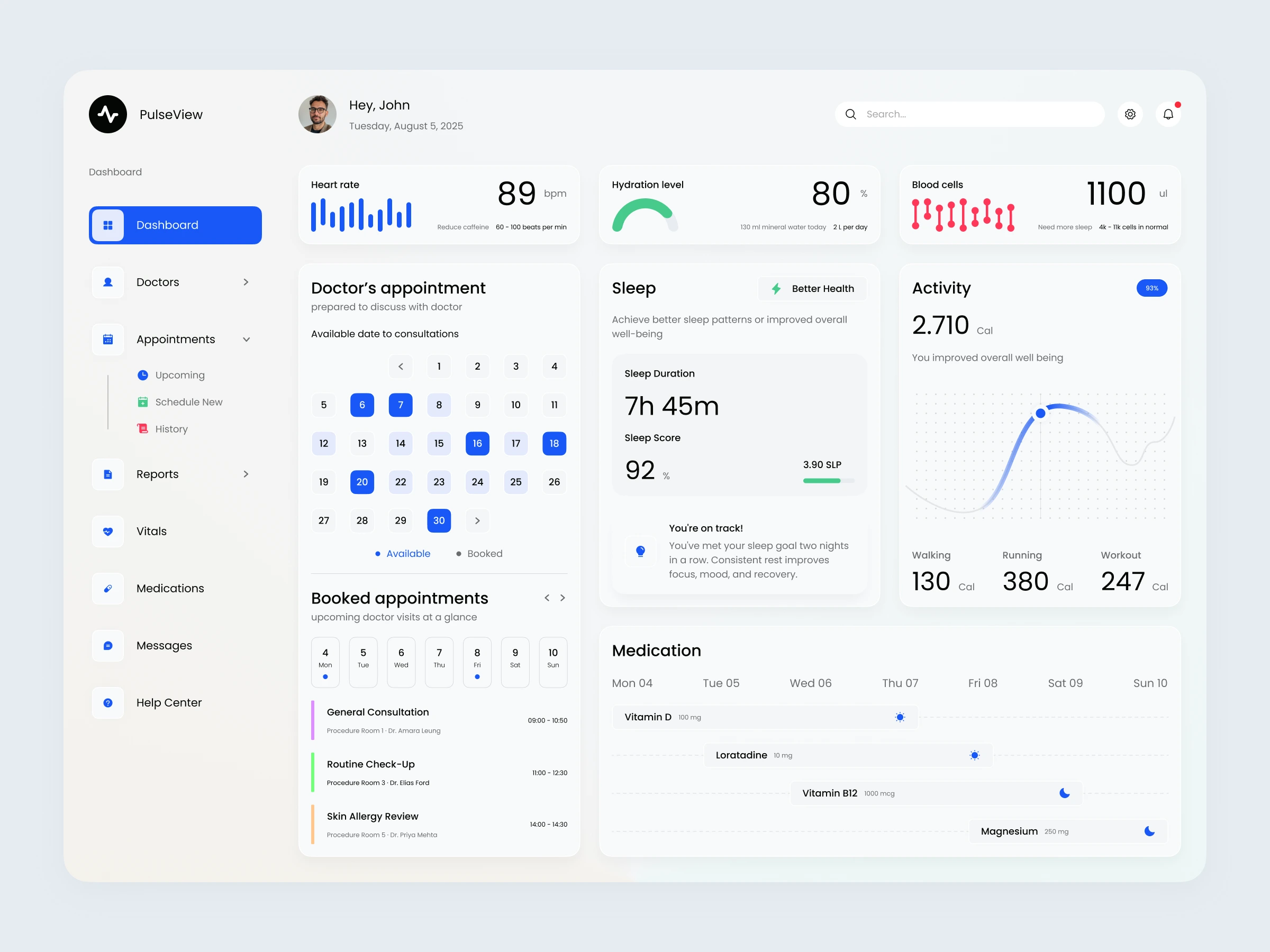 Built with clarity in mind, PulseView brings together vitals, activity stats, and upcoming consultations in one unified interface — helping users stay informed and in control of their well-being.