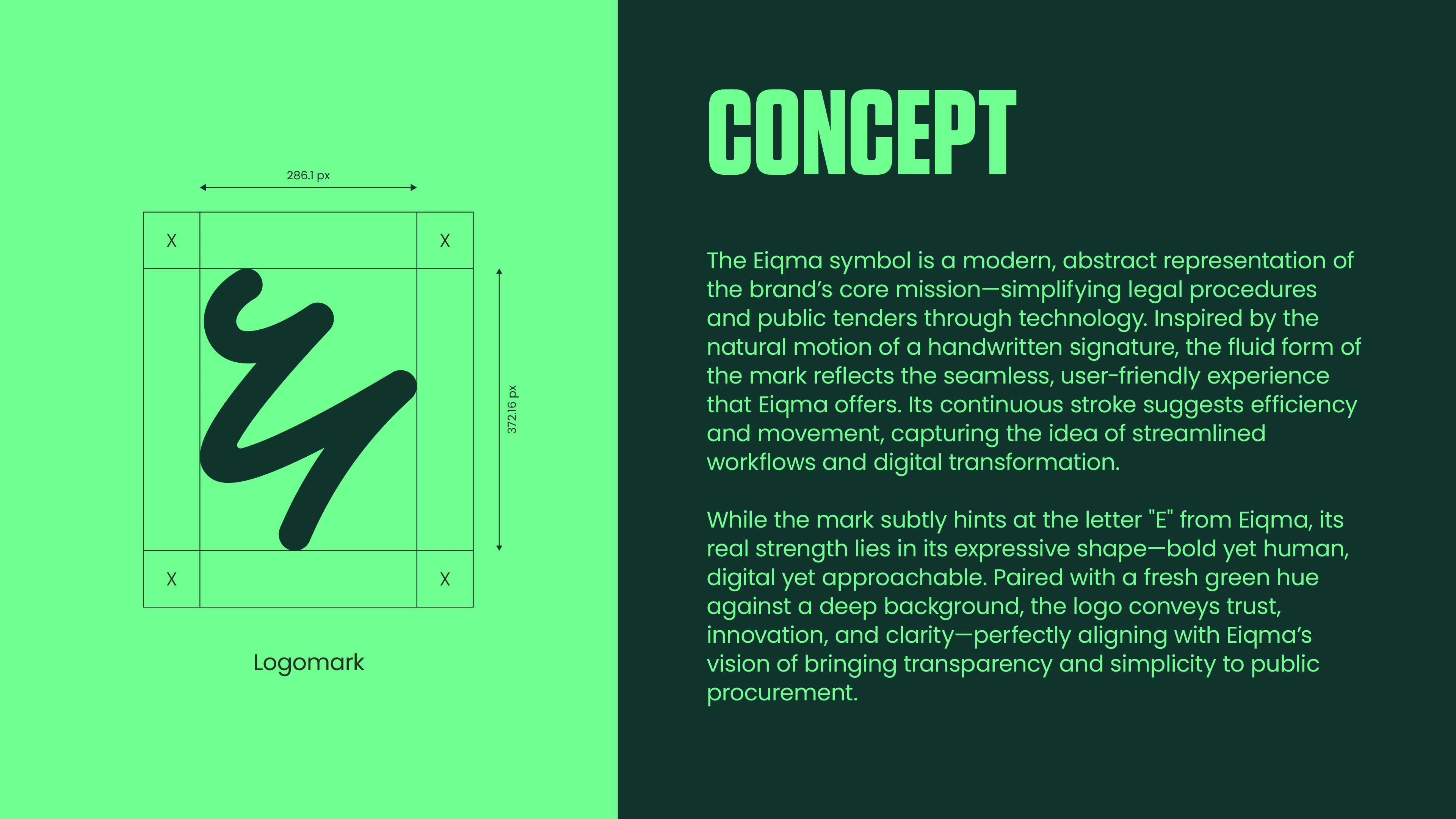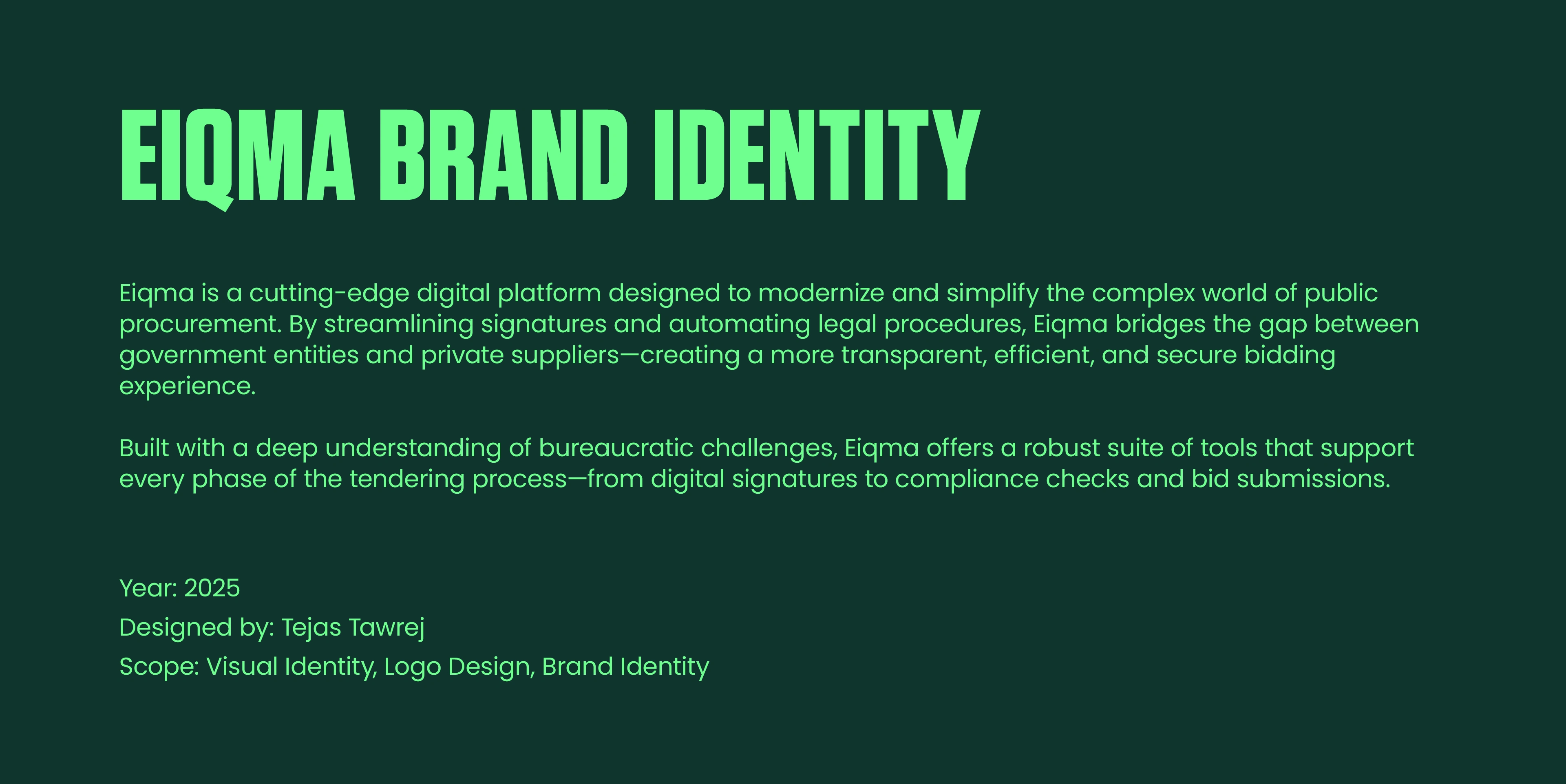 Eiqma is a modern SaaS platform that leverages technology to streamline digital signatures and legal procedures within public tenders. As a fast-scaling product in the GovTech and LegalTech space, Eiqma needed a visual identity that could reflect both its innovative capabilities and the trust-driven nature of public procurement. I redesigned their logo and full brand identity to align with the platform’s values—simplicity, security, and smart automation. The new symbol takes inspiration from the fluid motion of a signature, reimagined in a bold, modern form that represents seamless user experience and legal precision. Paired with a refined, tech-forward design system, the new brand presence positions Eiqma as a reliable and scalable SaaS solution for governments and suppliers alike—built to simplify complex processes through elegant, intuitive technology.
