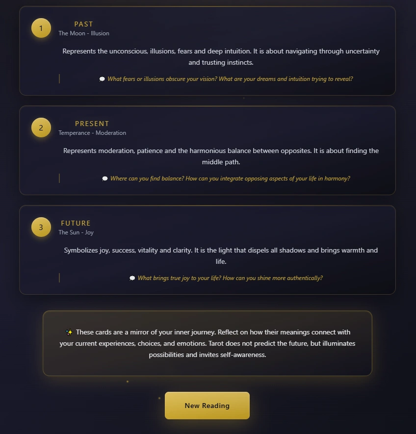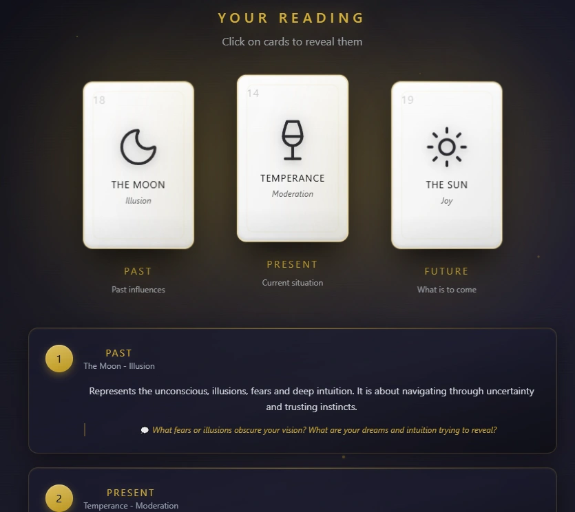 This is an experimental interactive prototype developed in Figma Make, combining minimalist design, 3D animations, and immersive experiences inspired by real Tarot cards. The goal was to create a digital experience that is both visually elegant, interactive, and reflective, encouraging users to think about their choices, emotions, and life situations.